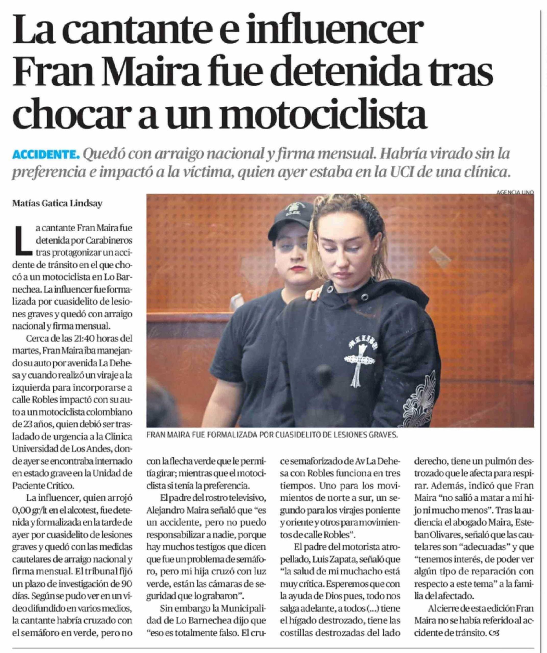 La cantante e influencer Fran Maira fue detenida tras chocar a un motociclista