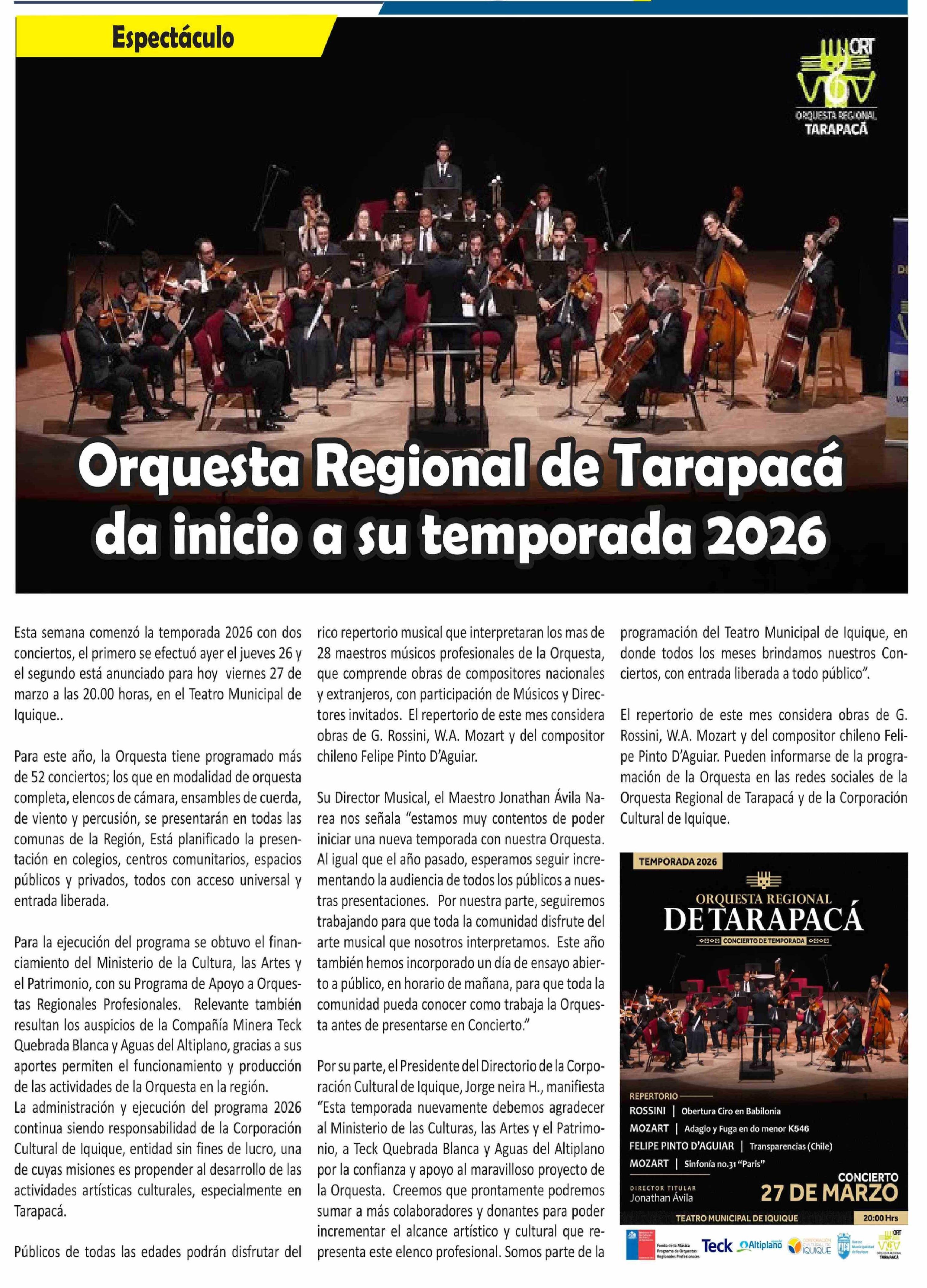 Orquesta Regional de Tarapacá da inicio a su temporada 2026