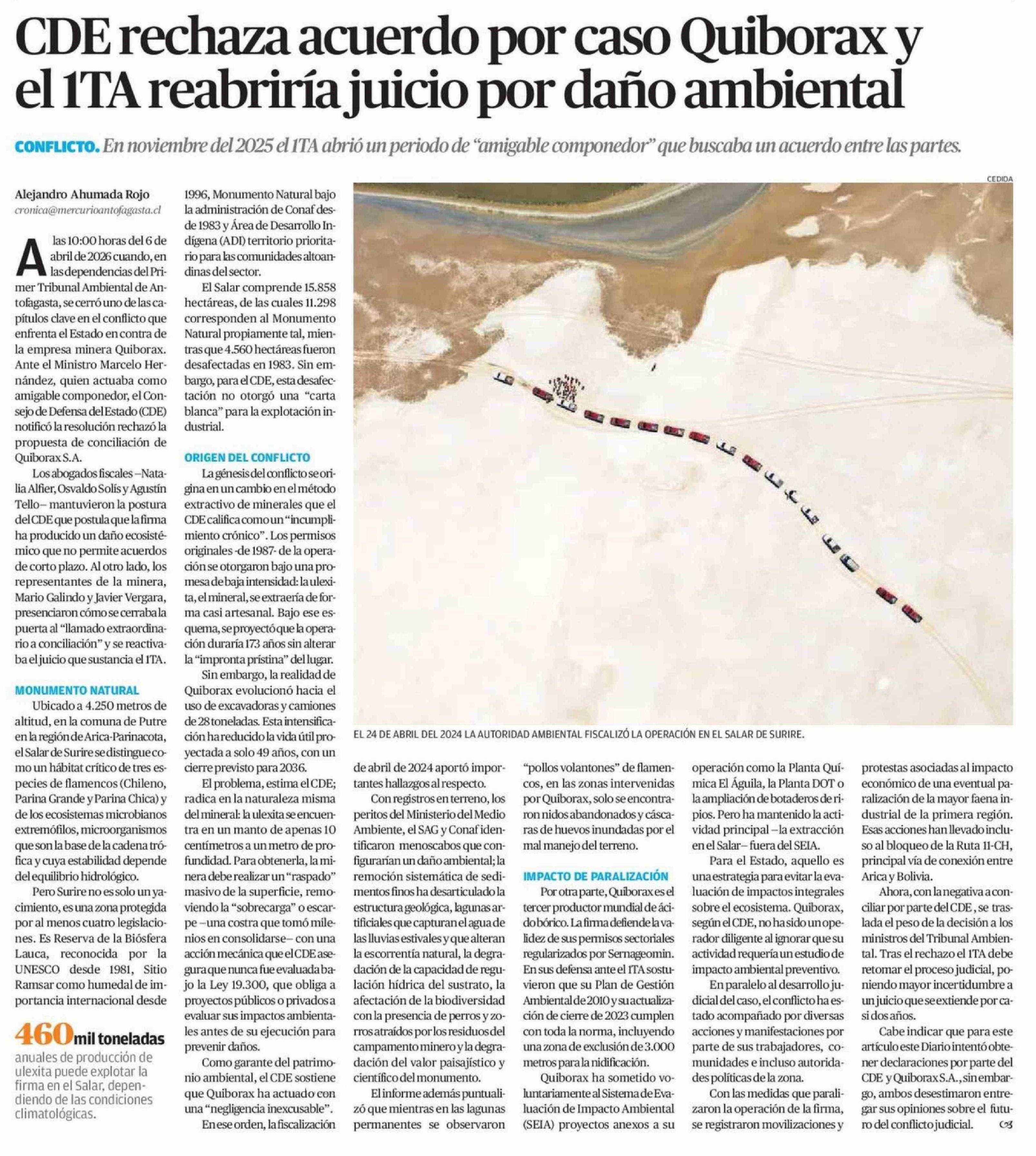 CDE rechaza acuerdo por caso Quiborax y el 1TA reabriría juicio por daño ambiental