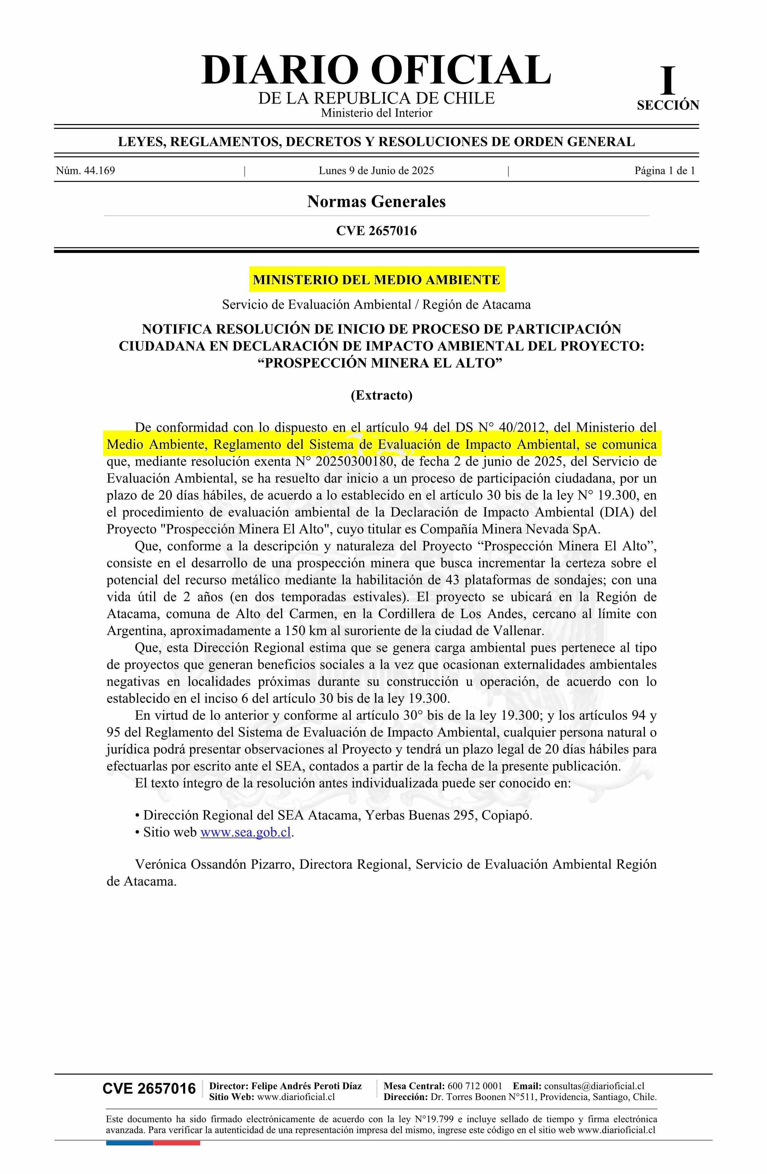 | Título: | Extracto de resolución exenta número 20250300180, de 2025.- Inicia proceso de participación ciudadana en Declaración de Impacto Ambiental del proyecto Prospección Minera El Alto |