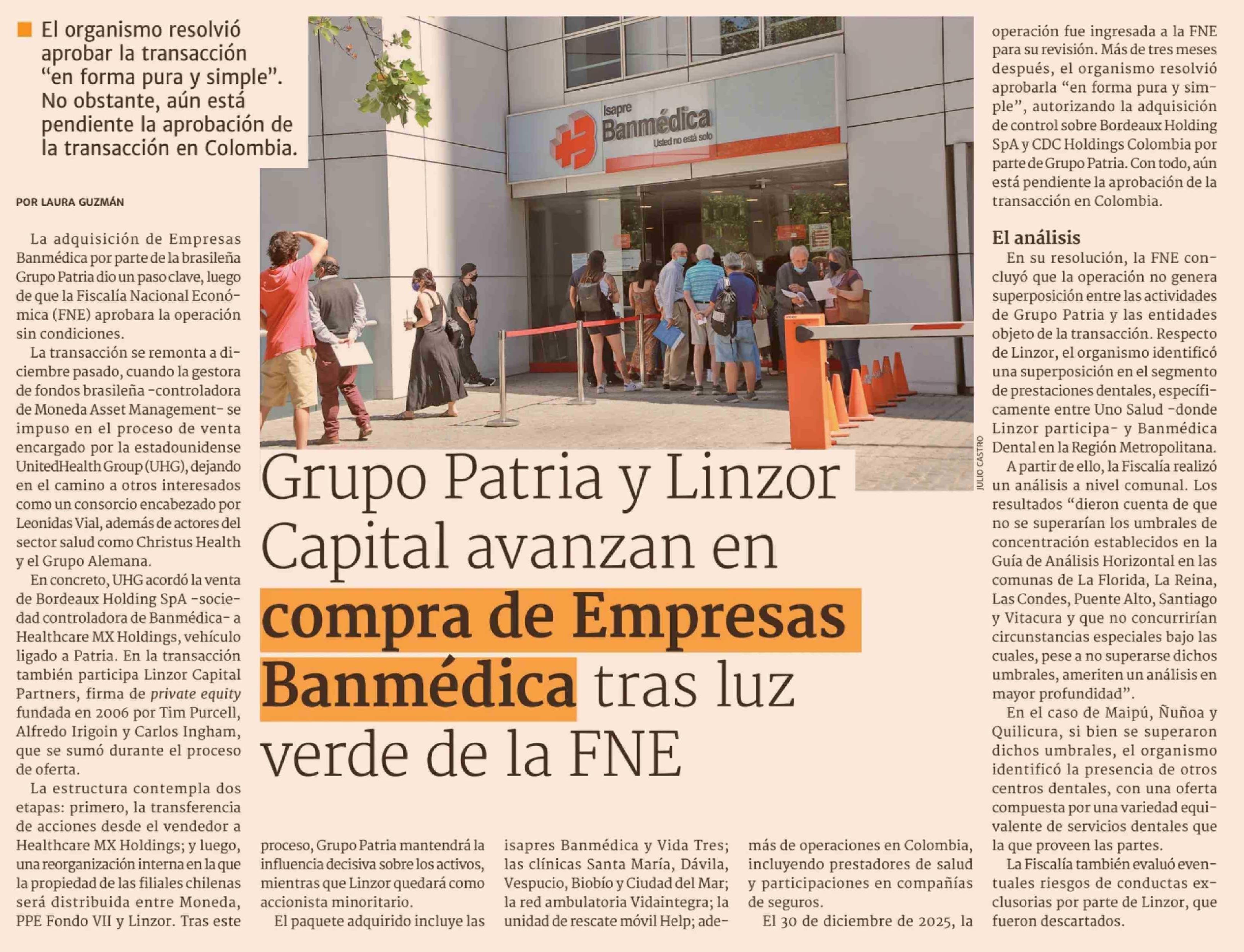 Grupo Patria y Linzor Capital avanzan en compra de Empresas Banmédica tras luz verde de la FNE
