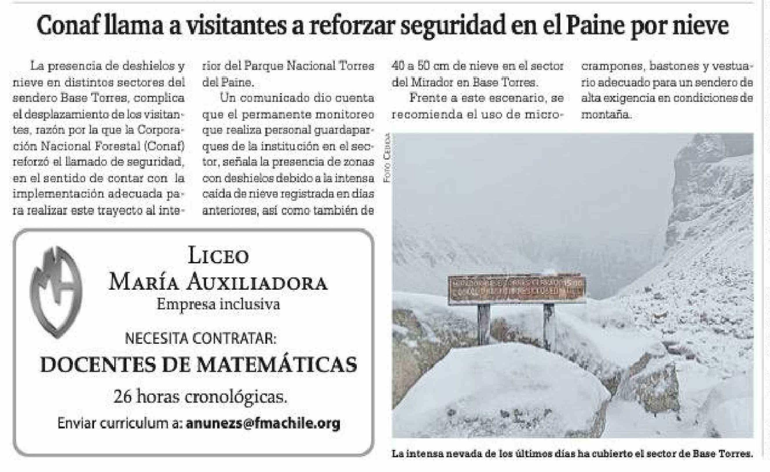 Conaf llama a visitantes a reforzar seguridad en el Paine por nieve