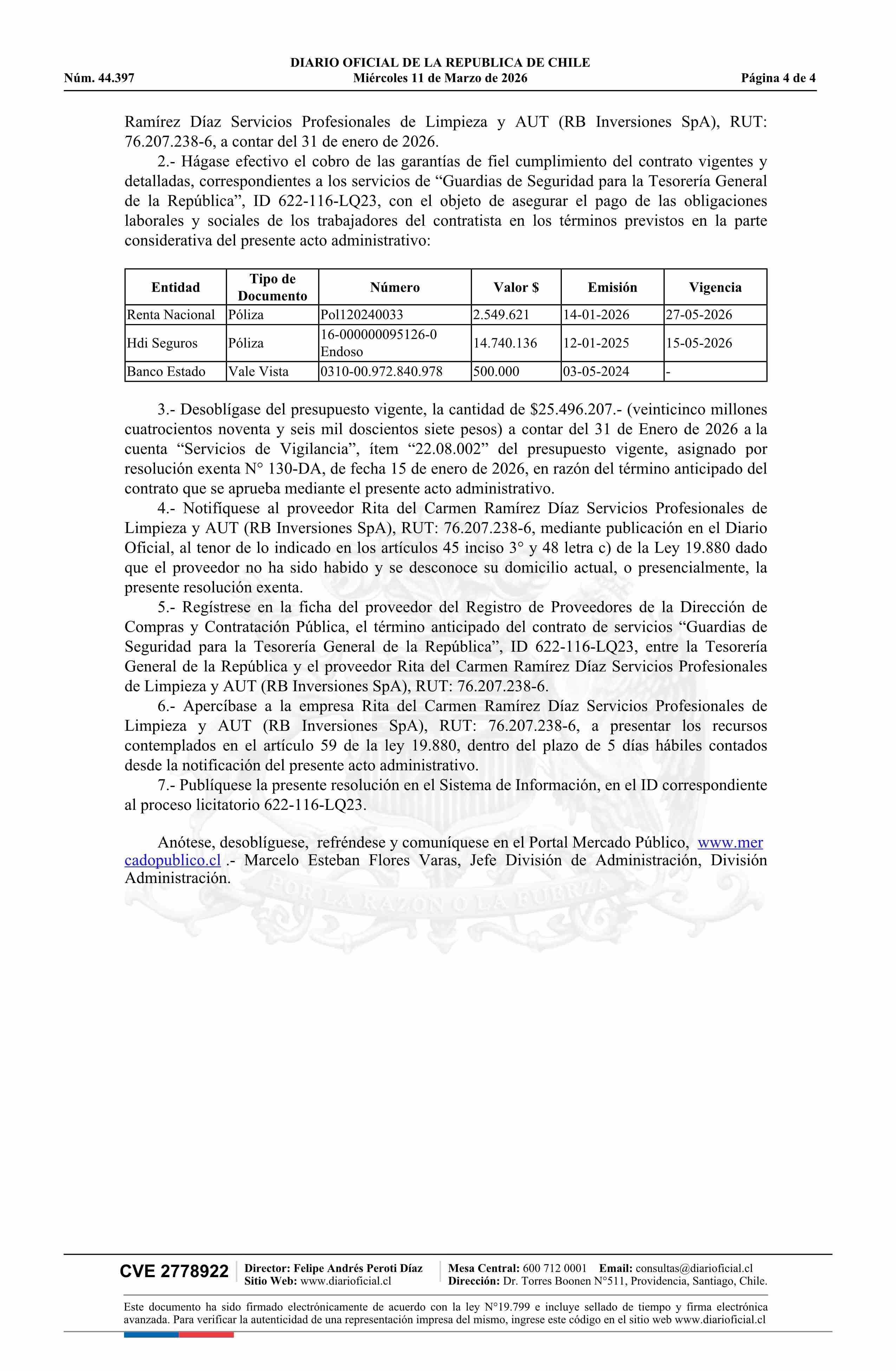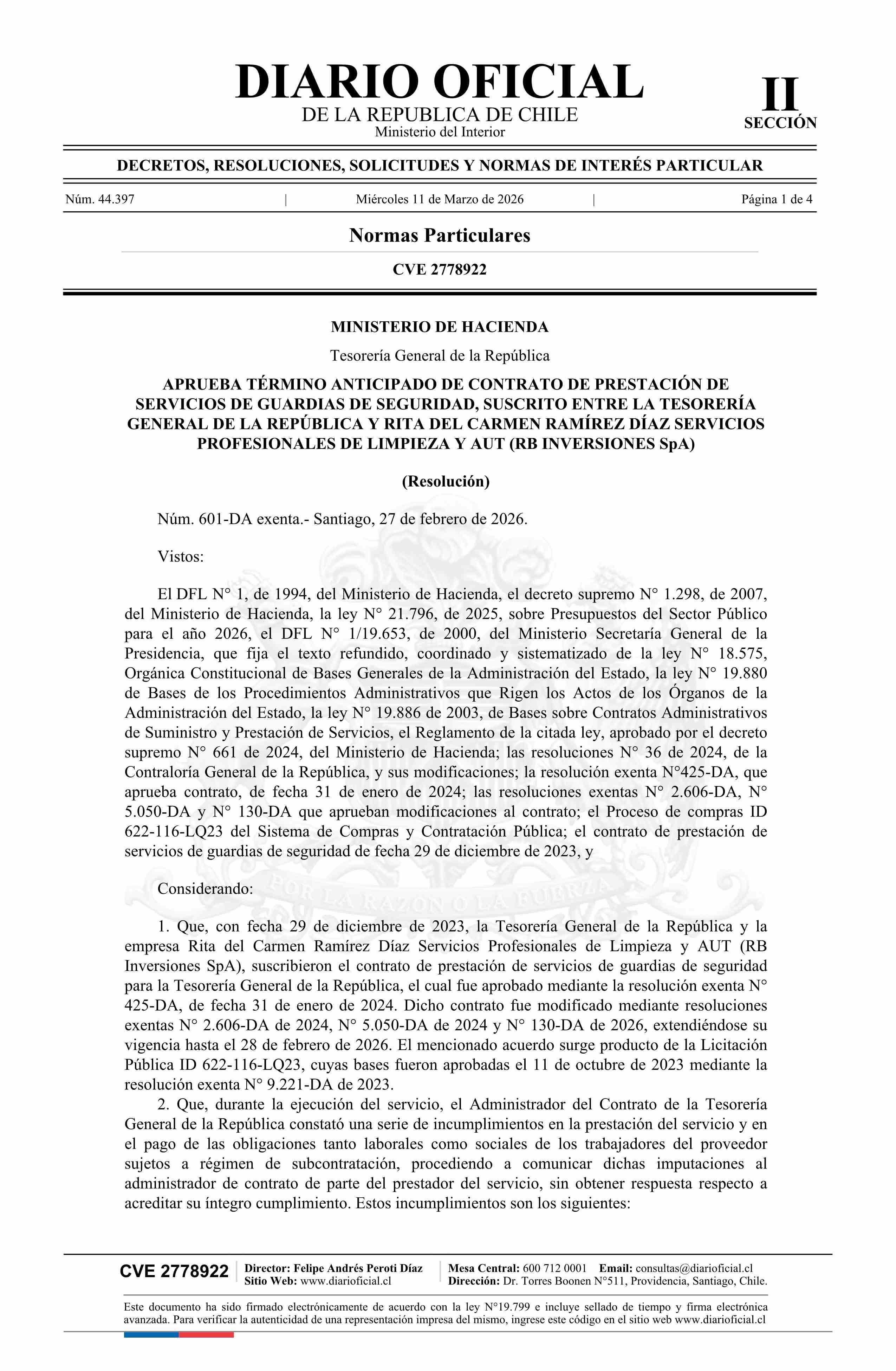 | Título: | Resolución exenta número 601-DA, de 2026.- Aprueba término anticipado de contrato de prestación de servicios de guardias de seguridad, suscrito entre la Tesorería General de la República y Rita del Carmen Ramírez Díaz Servicios Profesionales de Limpieza y Aut |