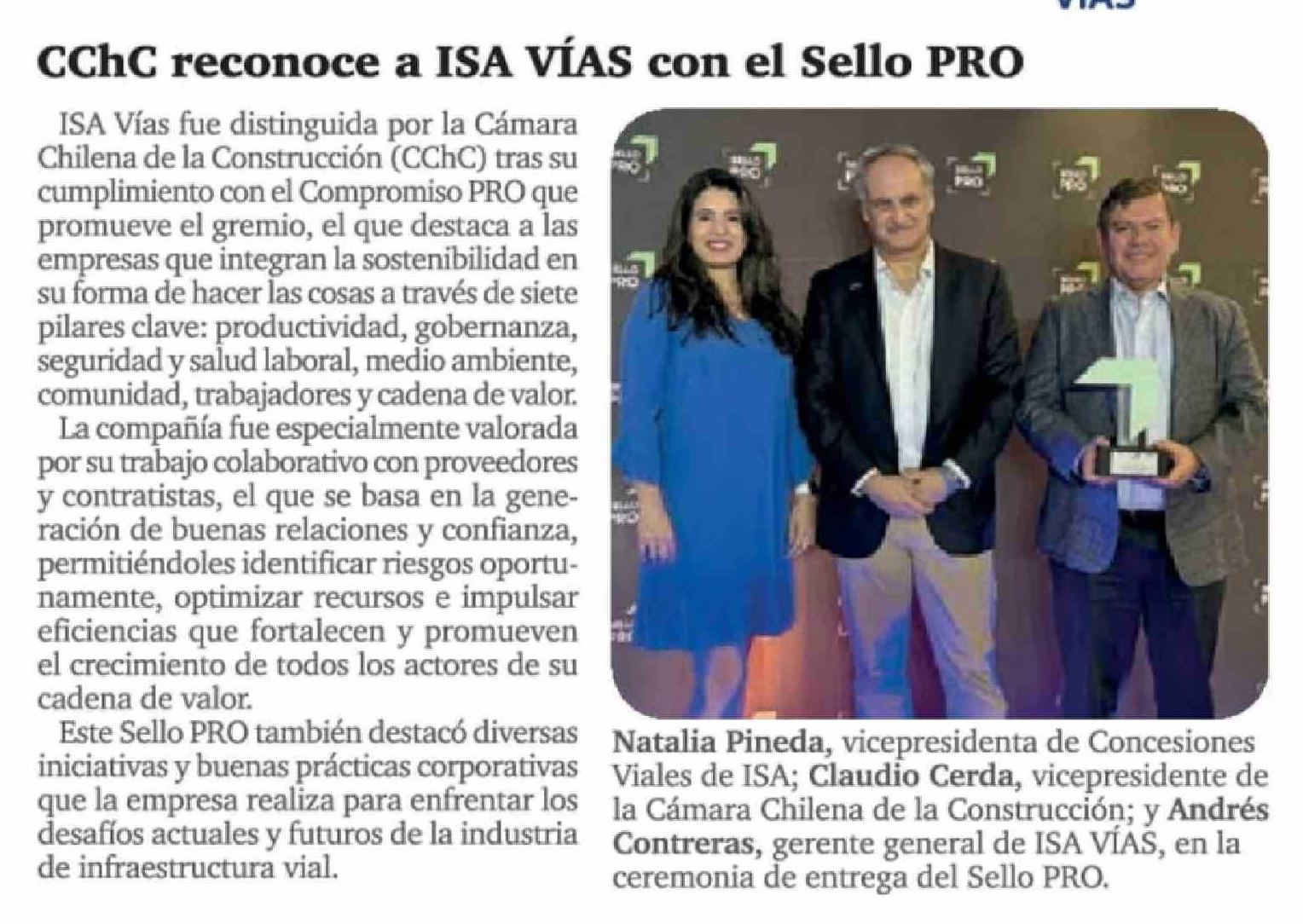 CChC reconoce a ISA VÍAS con el Sello PRO