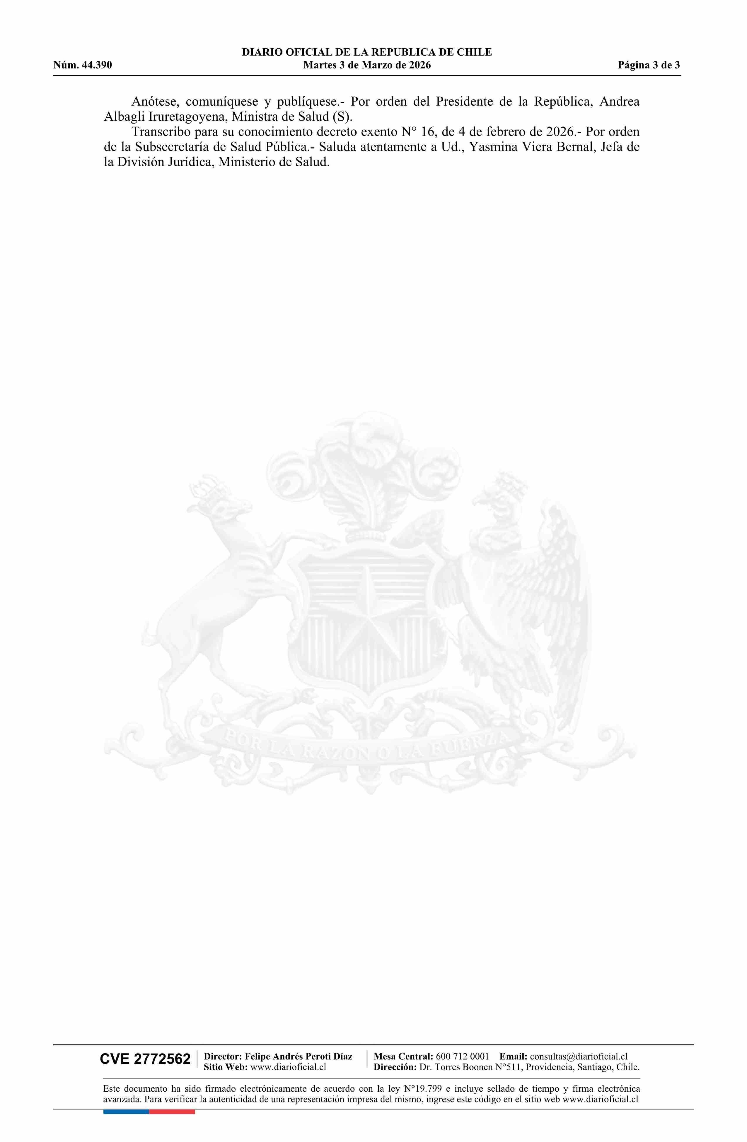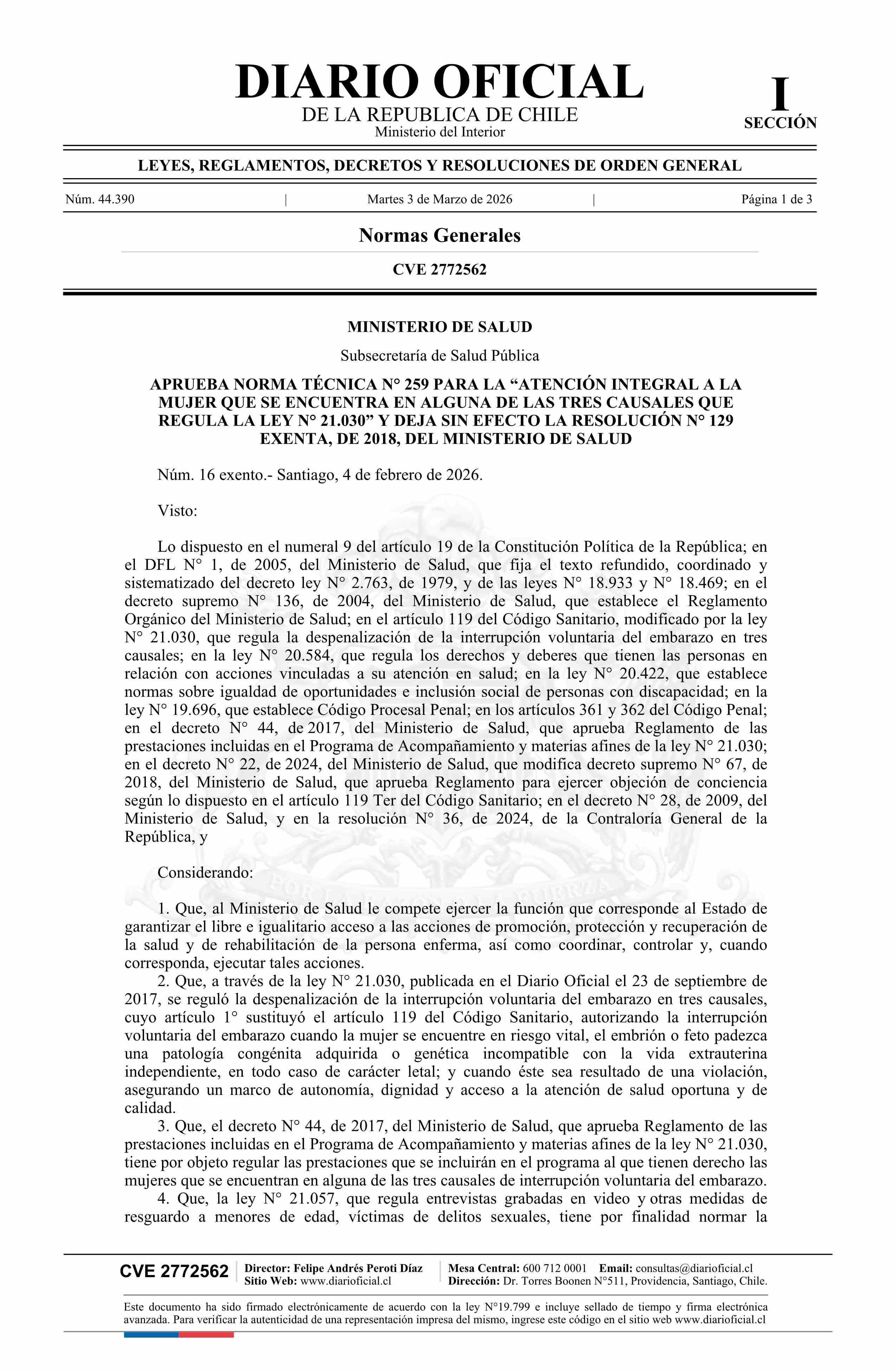 | Título: | Decreto exento número 16, de 2026.- Aprueba norma técnica N° 259 para la atención integral a la mujer que se encuentra en alguna de las tres causales que regula la ley N° 21.030 y deja sin efecto resolución N° 129 exenta, de 2018 |