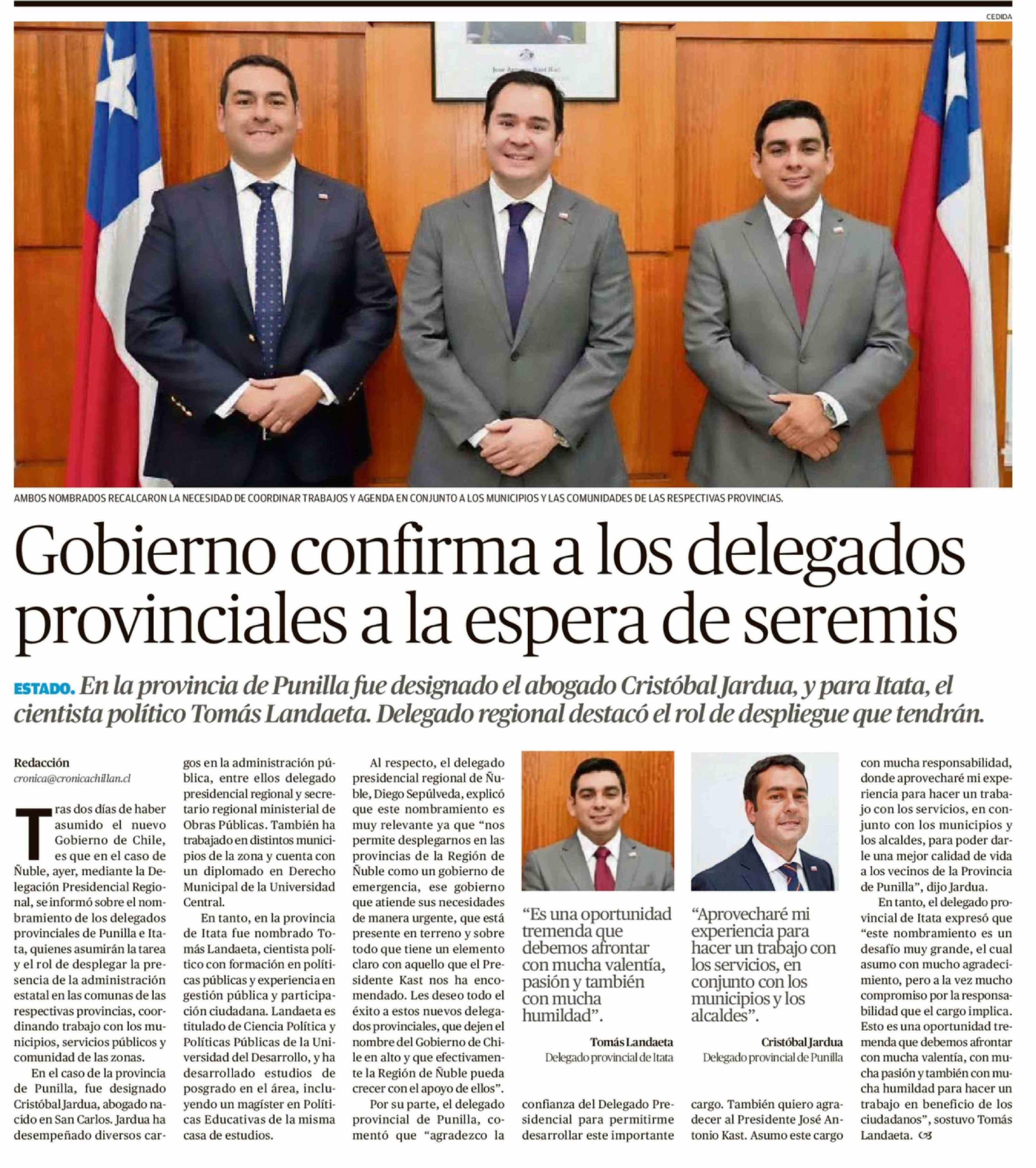 Gobierno confirma a los delegados provinciales a la espera de seremis
