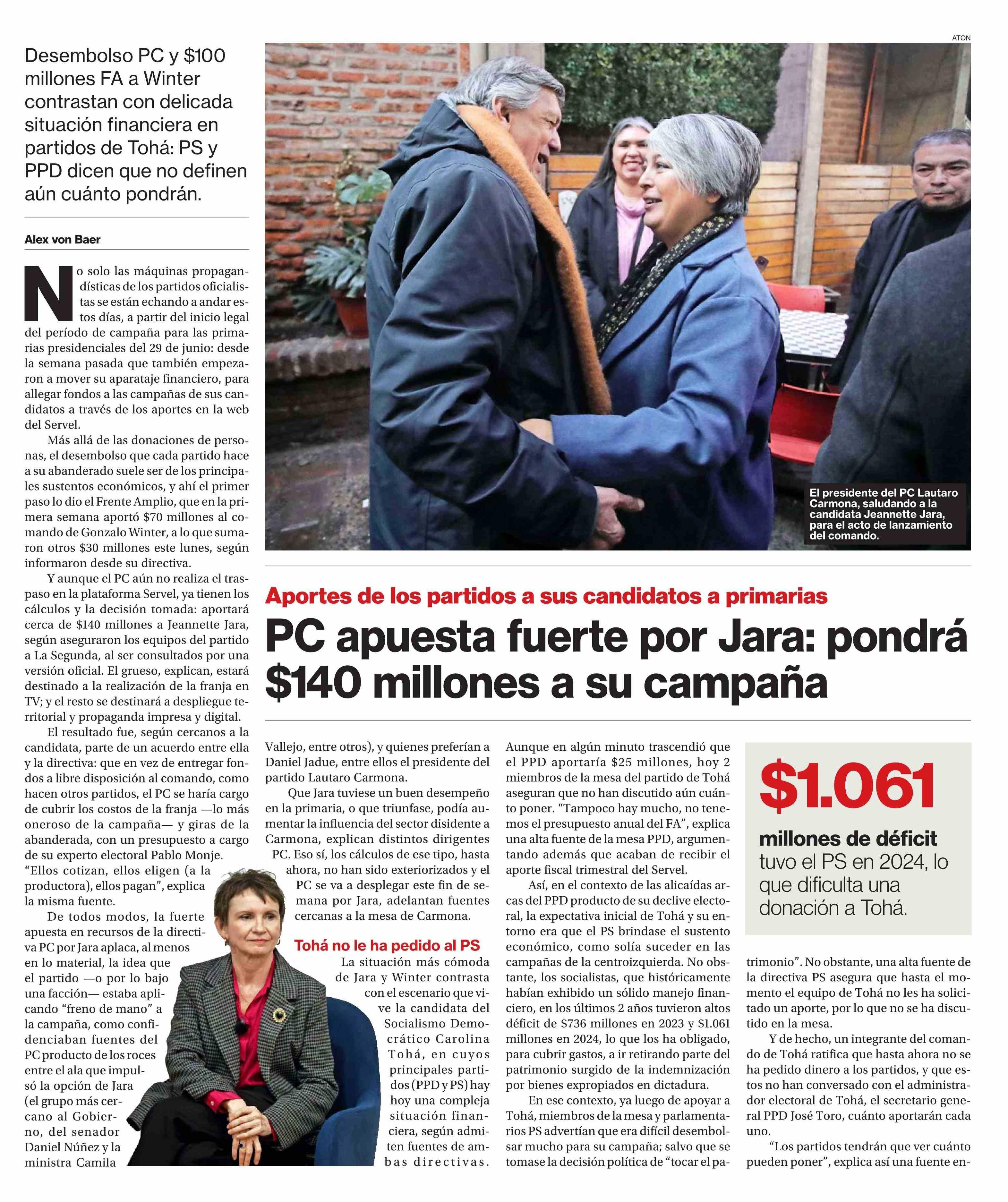 PC apuesta fuerte por Jara: pondrá $140 millones a su campaña