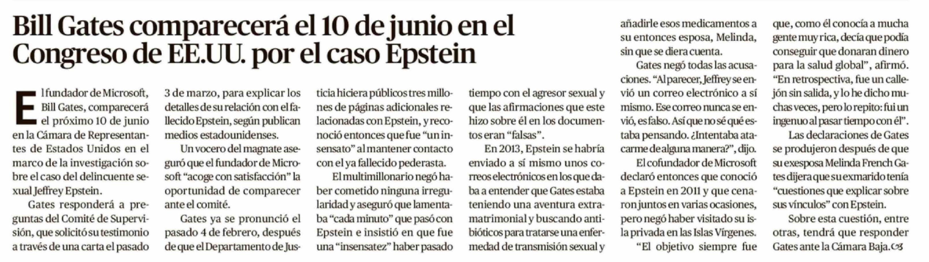Bill Gates comparecerá el 10 de junio en el Congreso de EE.UU. por el caso Epstein
