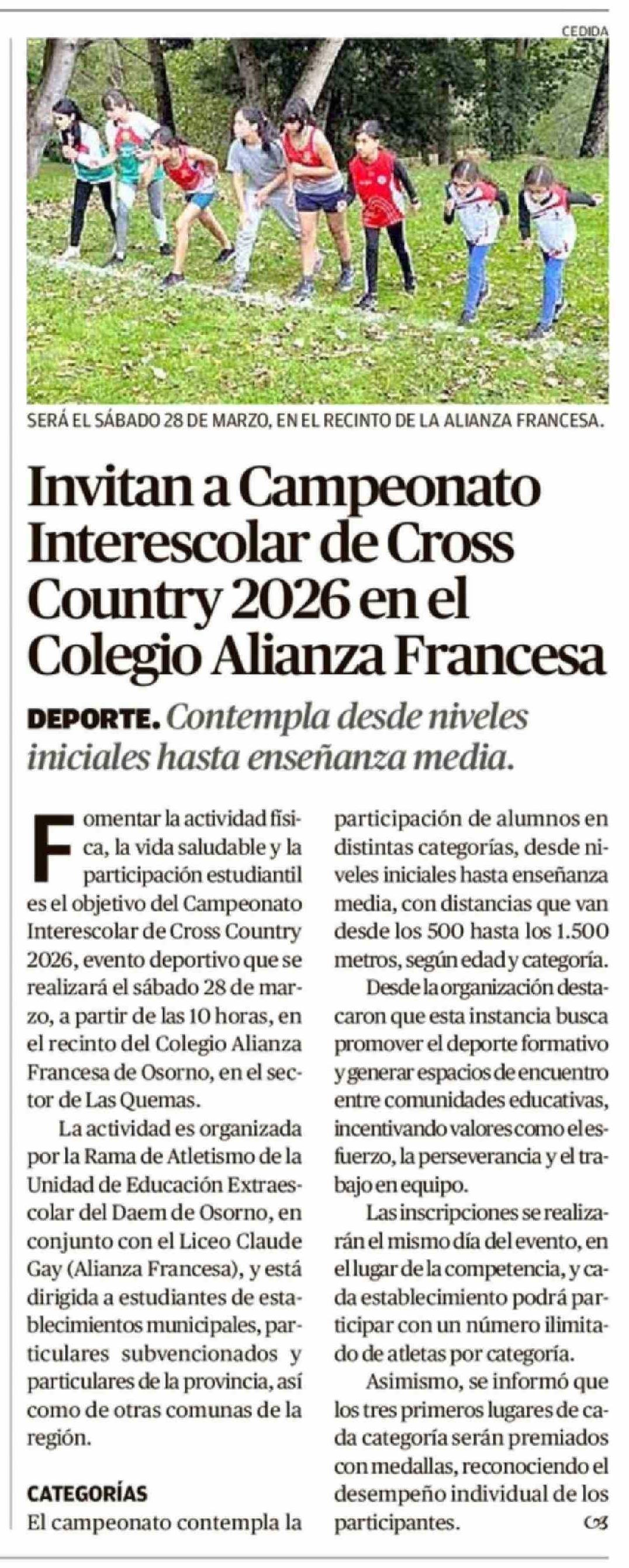 Invitan a Campeonato Interescolar de Cross Country 2026 en el Colegio Alianza Francesa