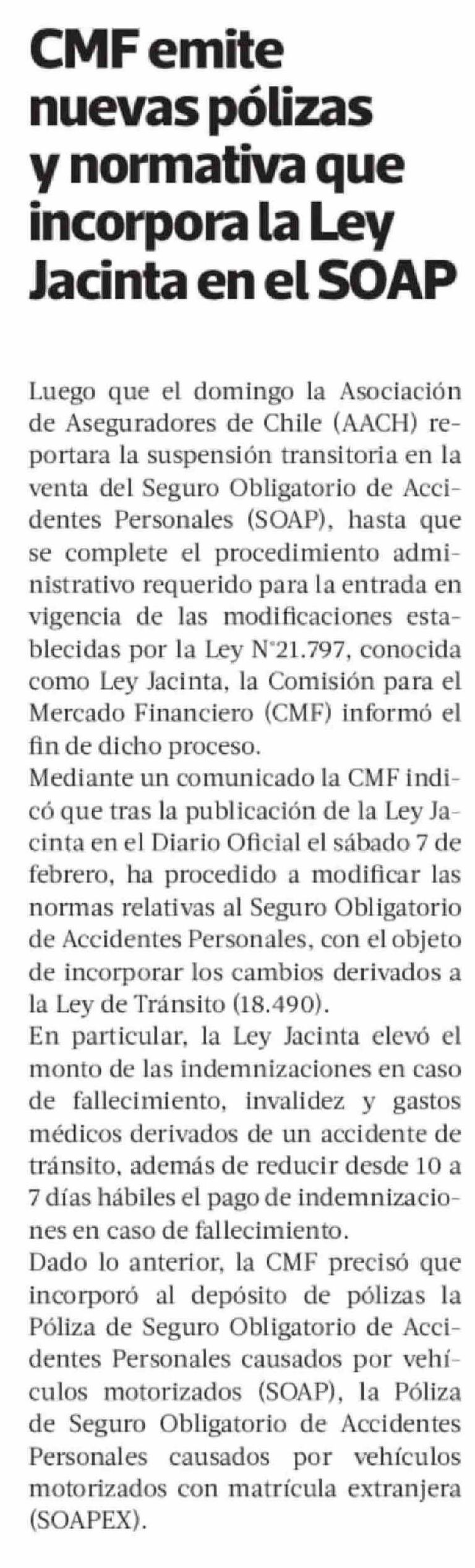 CMF emite nuevas pólizas y normativa que incorpora la Ley Jacinta en el SOAP