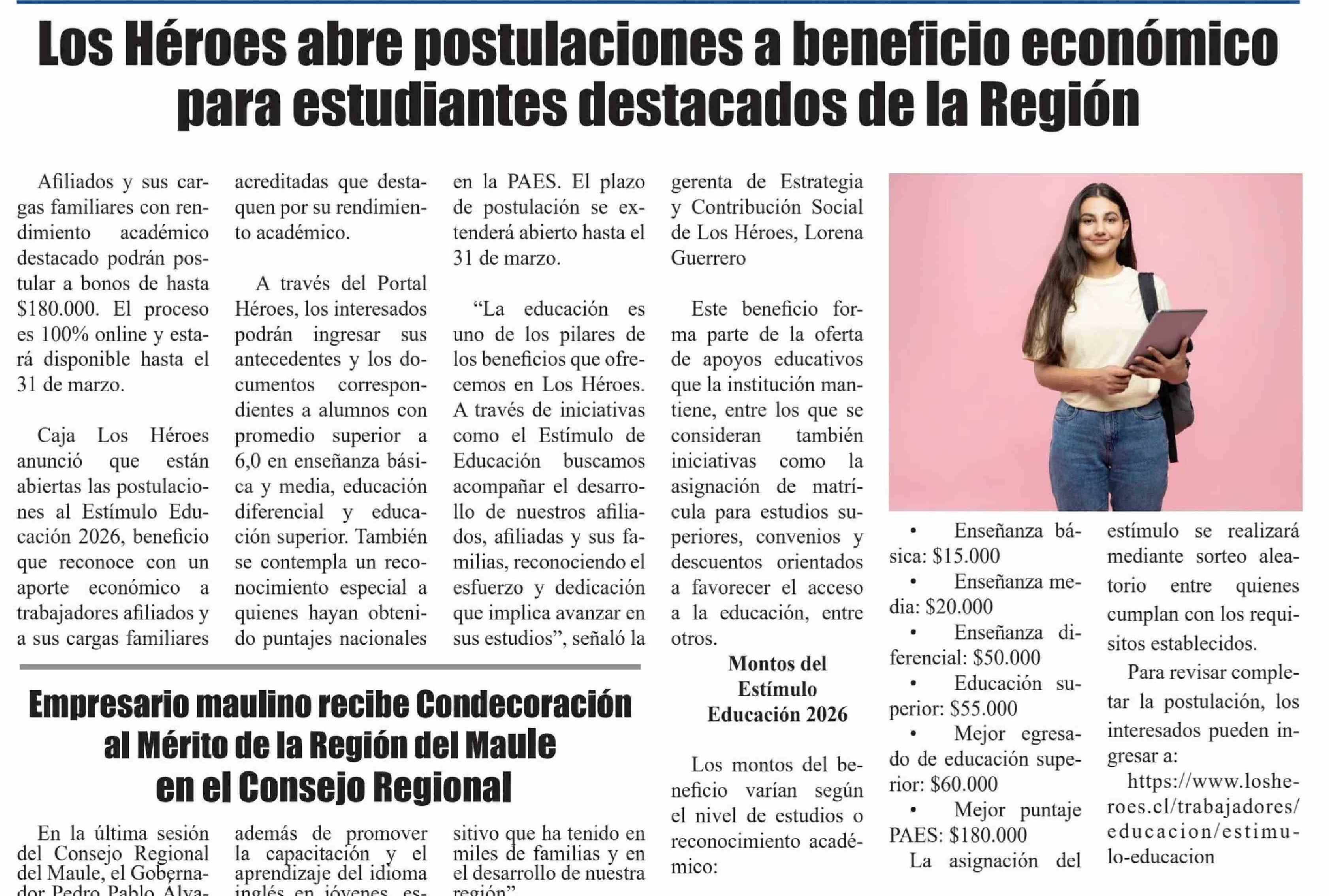 Título: Los Héroes abre postulaciones a beneficio económico para estudiantes destacados de la Región