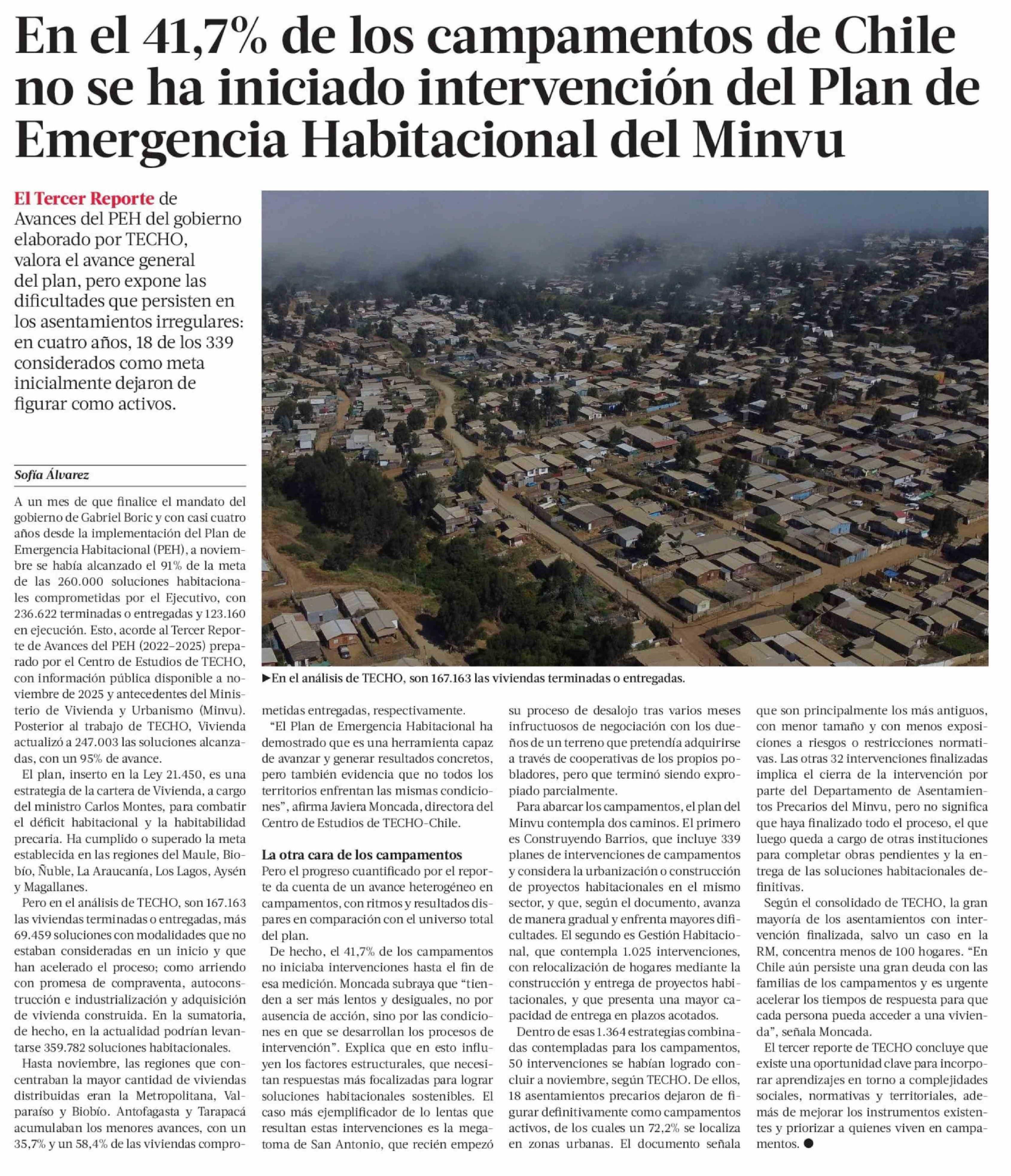 En el 41,7% de los campamentos de Chile no se ha iniciado intervención del Plan de Emergencia Habitacional del Minvu