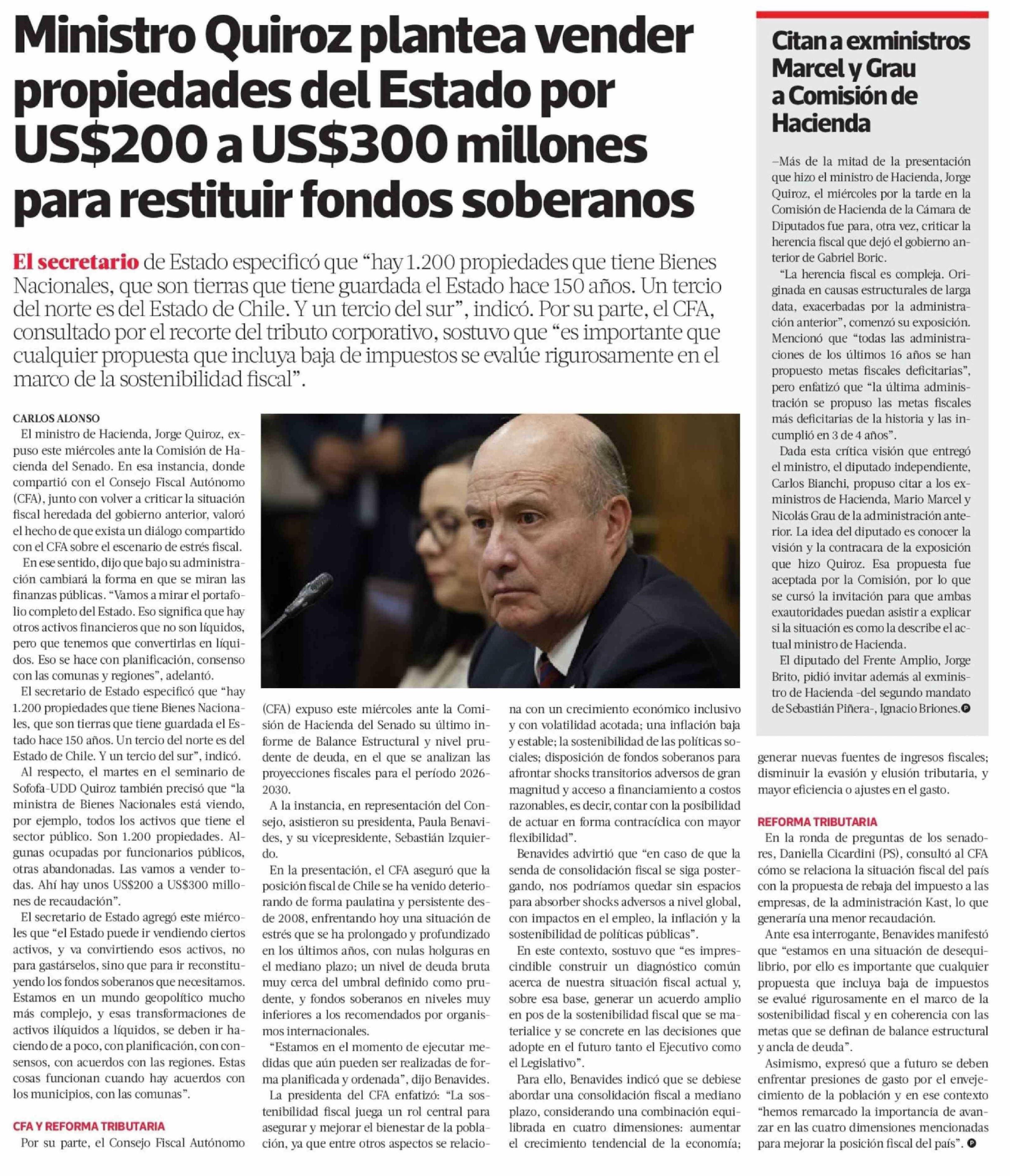Ministro Quiroz plantea vender propiedades del Estado por US$200 a US$300 millones para restituir fondos soberanos