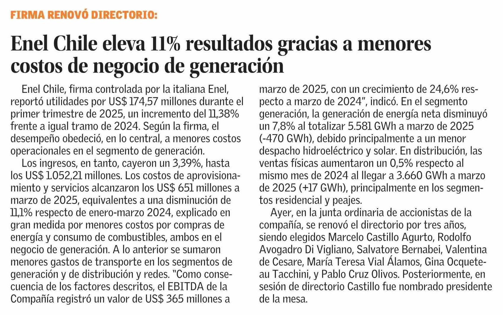 Enel Chile eleva 11% resultados gracias a menores costos de negocio de generación