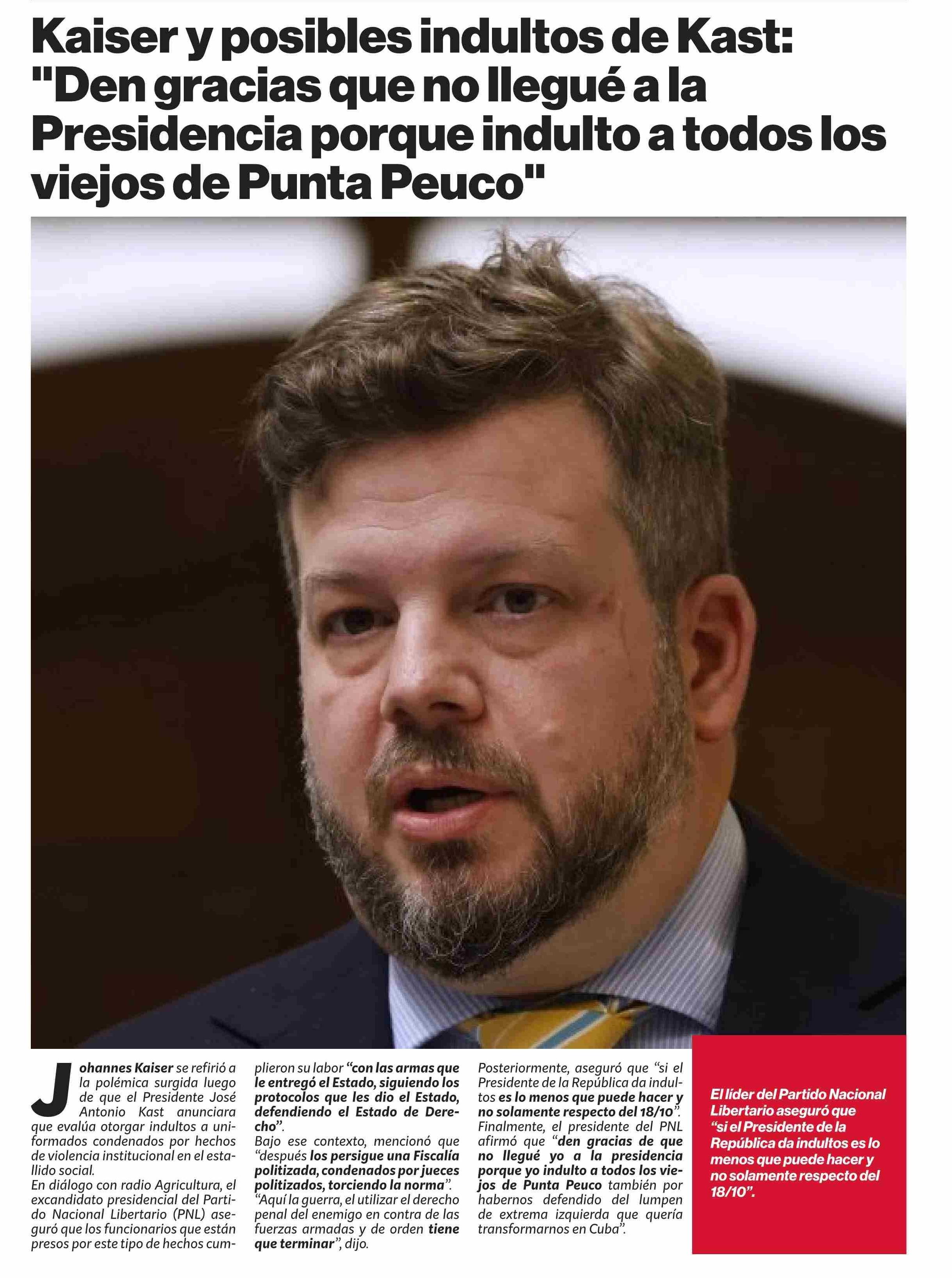 Kaiser y posibles indultos de Kast: "Den gracias que no llegué a la Presidencia porque indulto atodos los viejos de Punta Peuco”