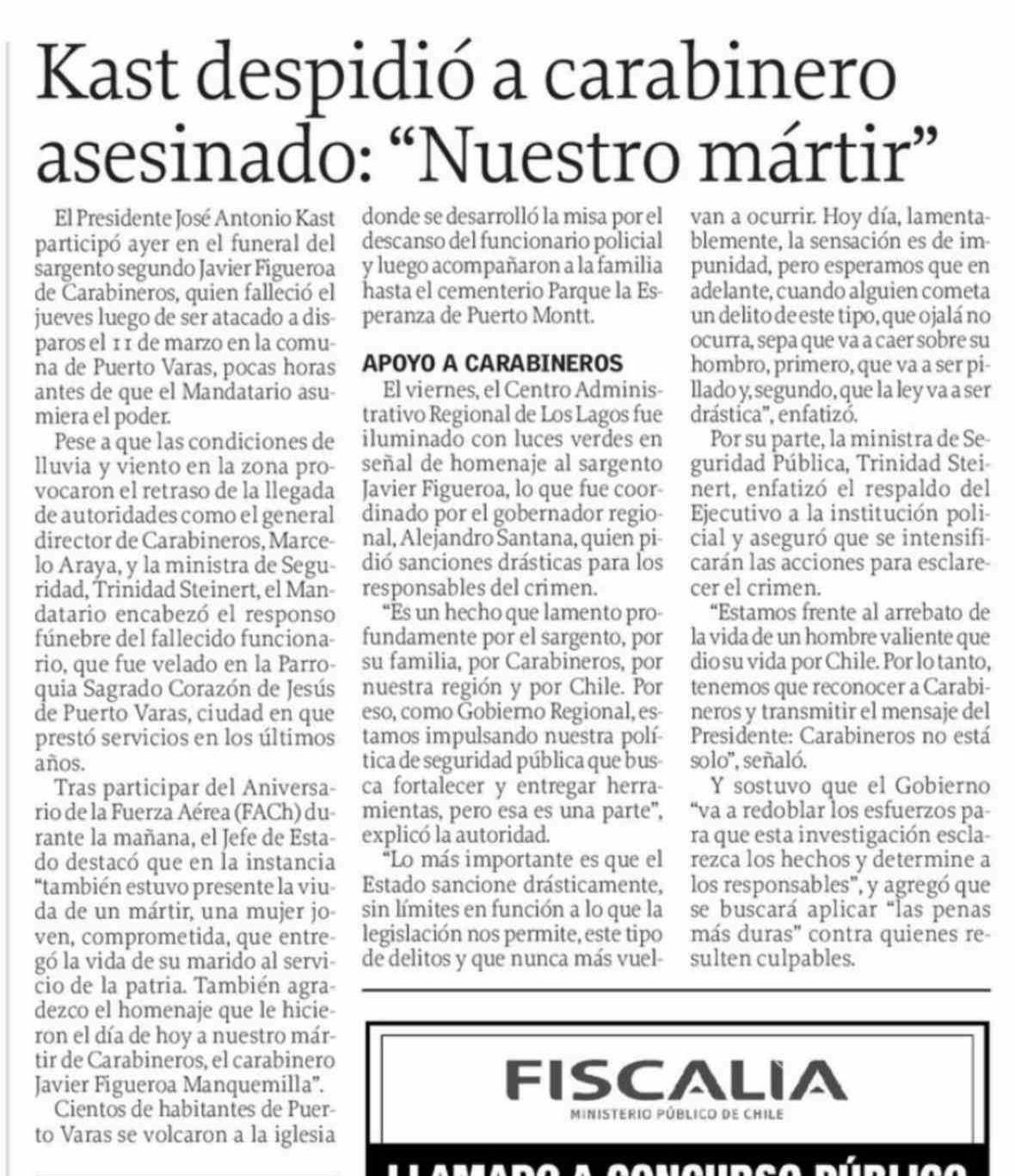 Kast despidió a carabinero asesinado: "Nuestro mártir"