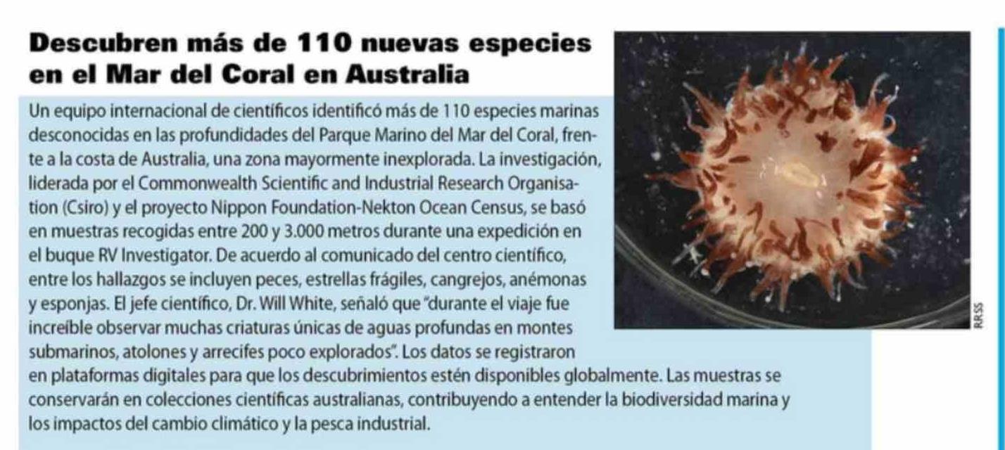 | Título: | Descubren más de 110 nuevas especies en el Mar del Coral en Australia Un equipo internacional de científicos identificó más de 110 especies marinas desconocidas en las profundidades del Parque Marino del Mar del Coral, frente a la costa de Australia, una zona mayormente inexplorada. La investigación |