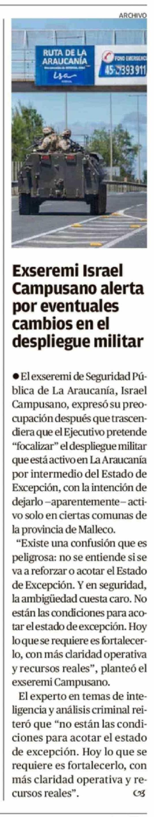 Exseremi Israel Campusano alerta por eventuales cambios en el despliegue militar