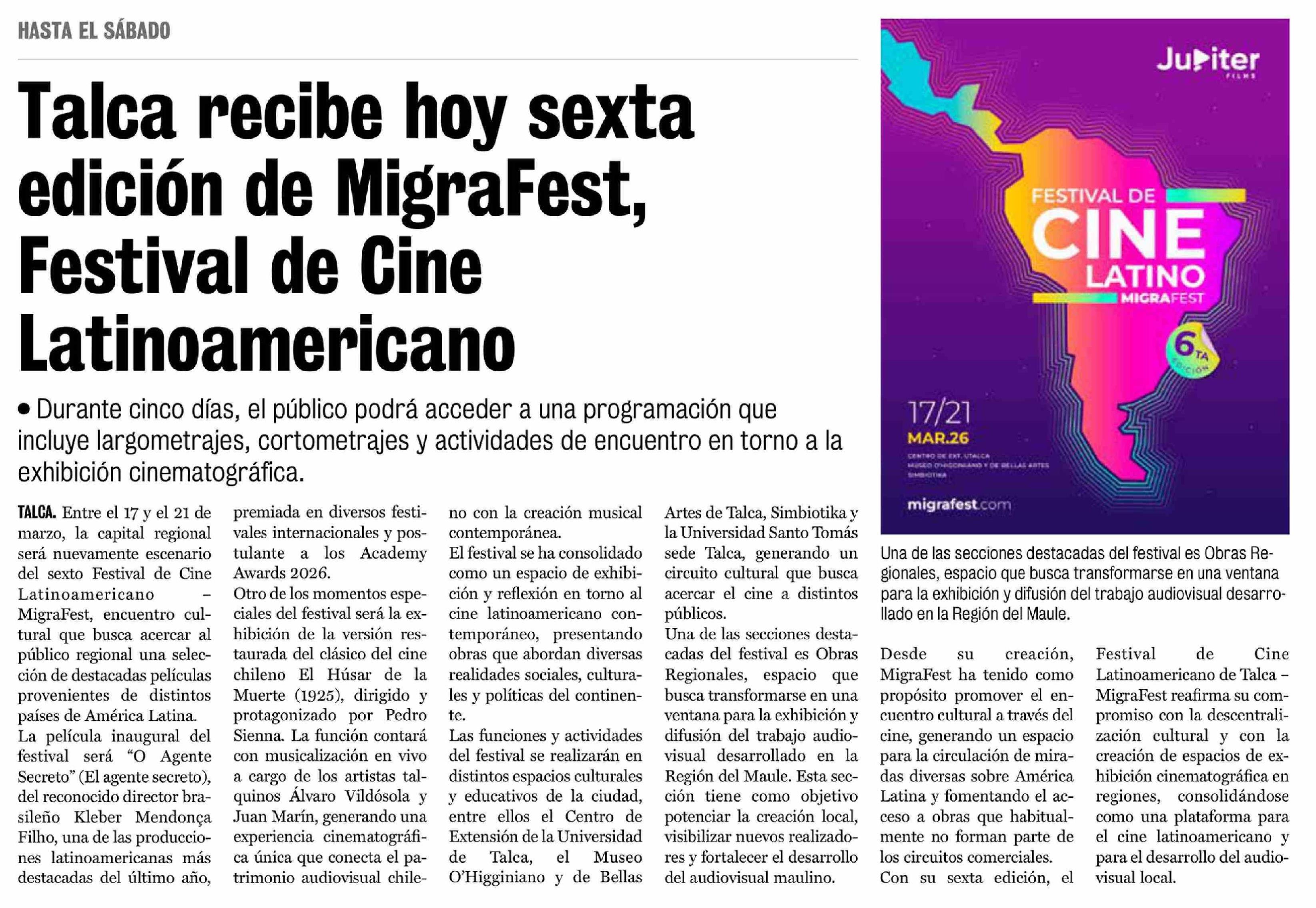 Talca recibe hoy sexta edición de MigraFest, Festival de Cine Latinoamericano