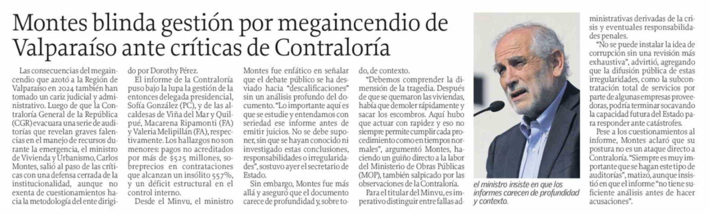 Montes blinda gestión por megaincendio de Valparaíso ante críticas de Contraloría