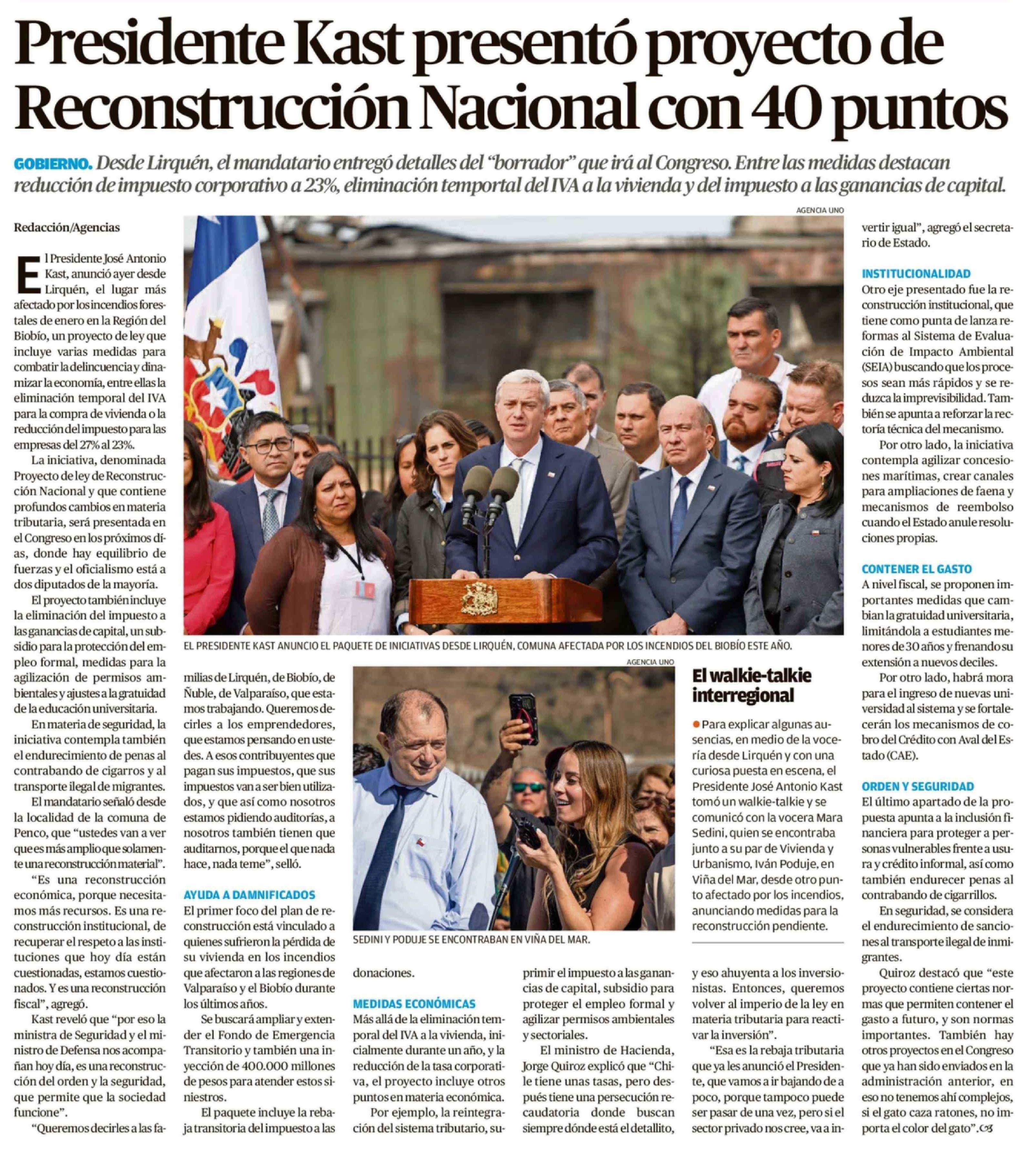 Presidente Kast presentó proyecto de Reconstrucción Nacional con 40 puntos