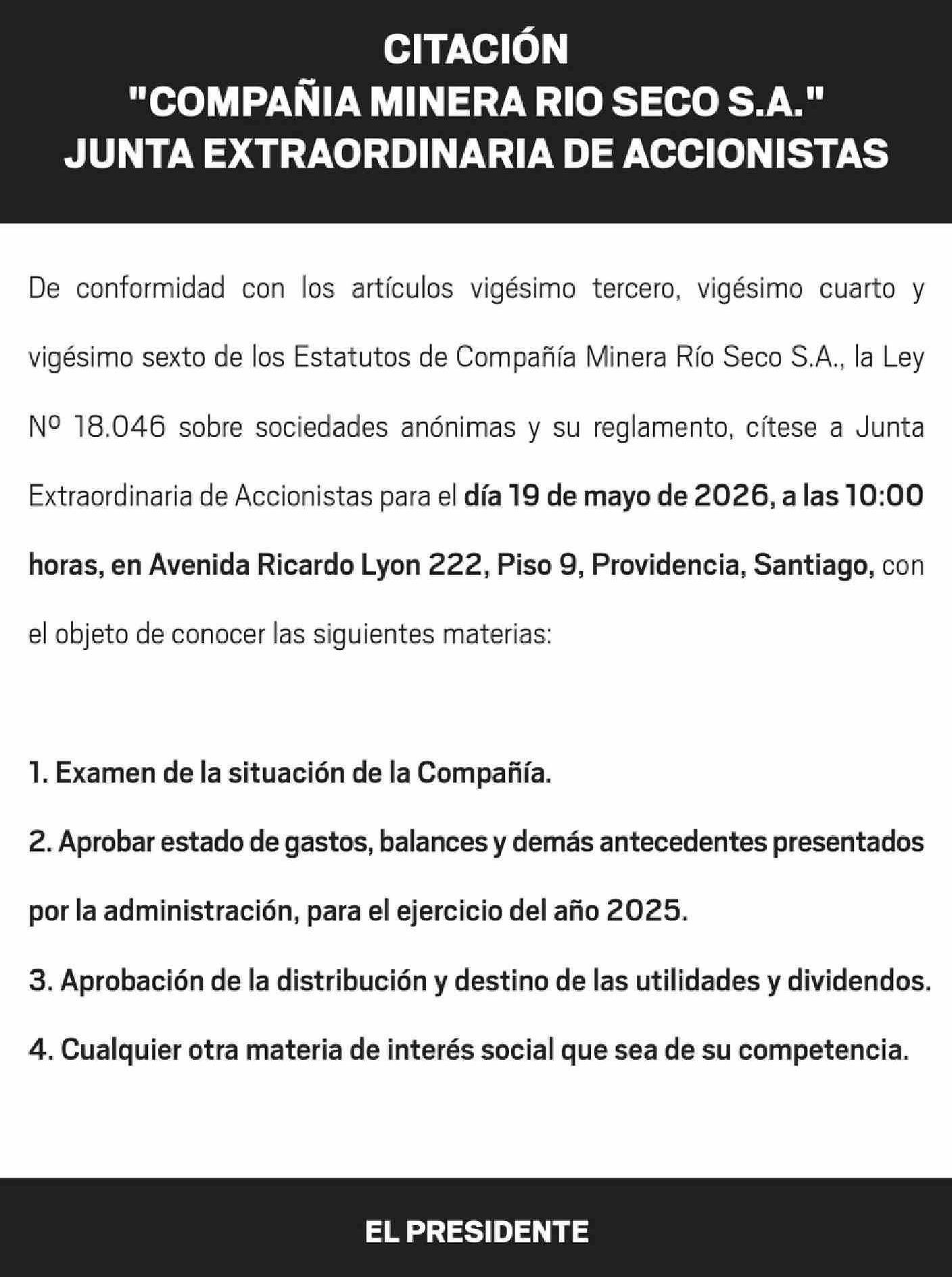 Título: Extractos: CITACIÓN "COMPAÑIA MINERA RIO SECO S.A." JUNTA EXTRAORDINARIA DE ACCIONISTAS