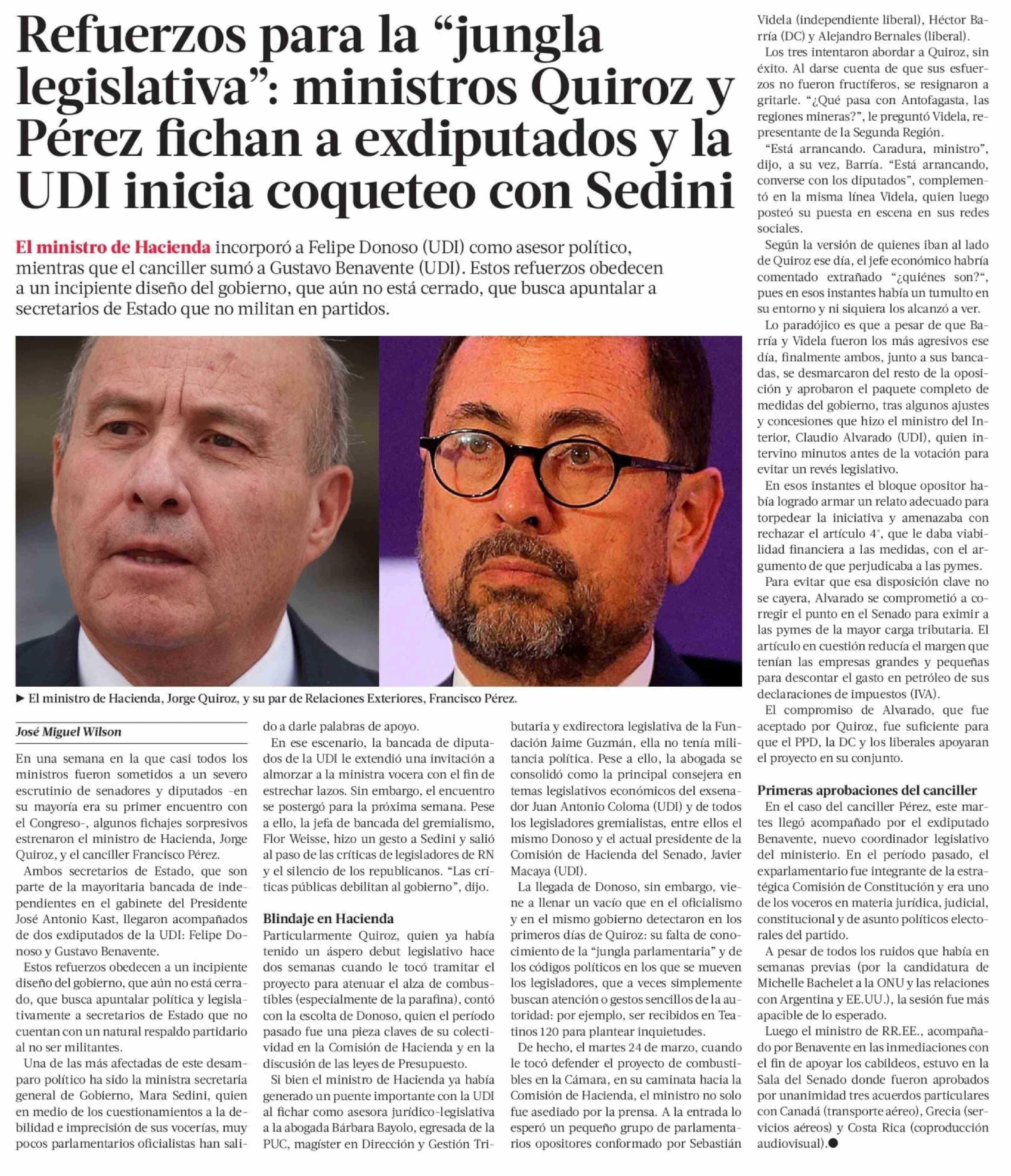 Título: Refuerzos para la "jungla legislativa": ministros Quiroz y Pérez fichan a exdiputados y la UDI inicia coqueteo con Sedini