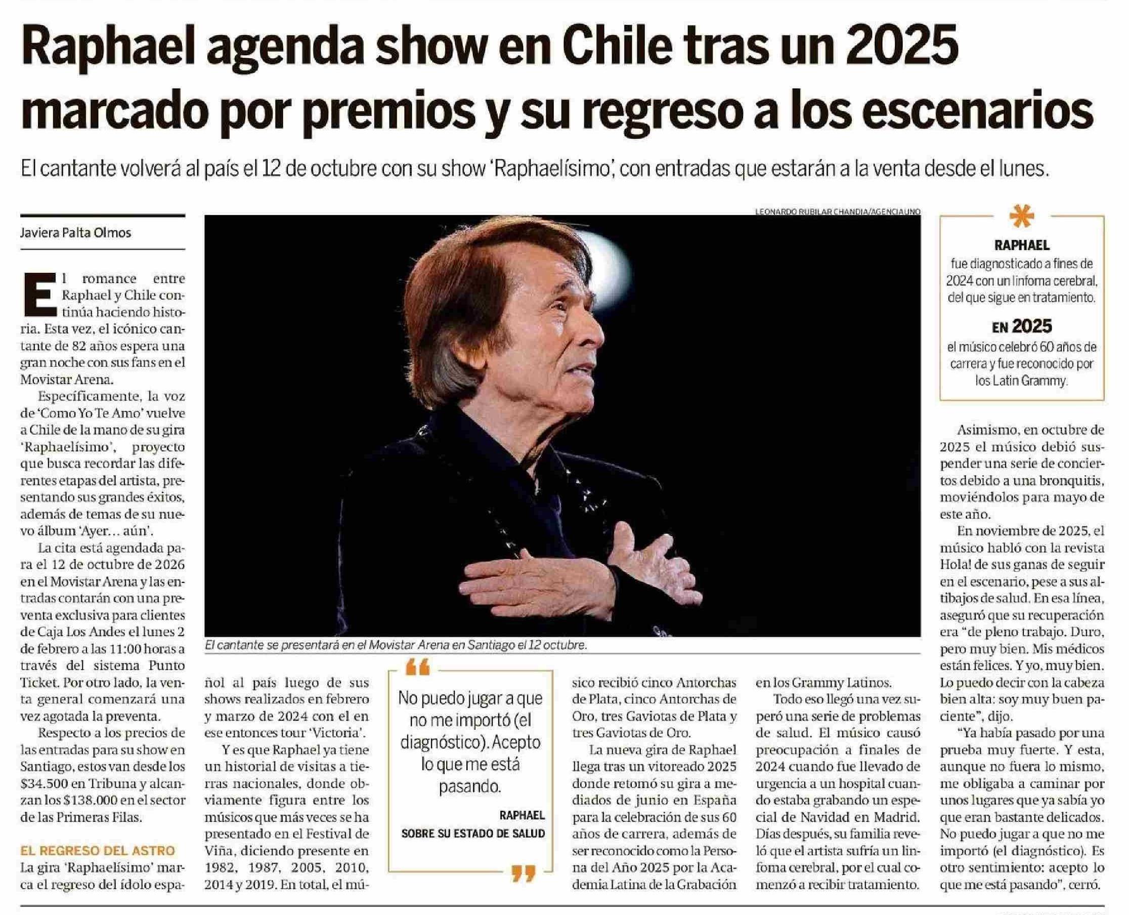 Raphael agenda show en Chile tras un 2025 marcado por premios y su regreso a los escenarios