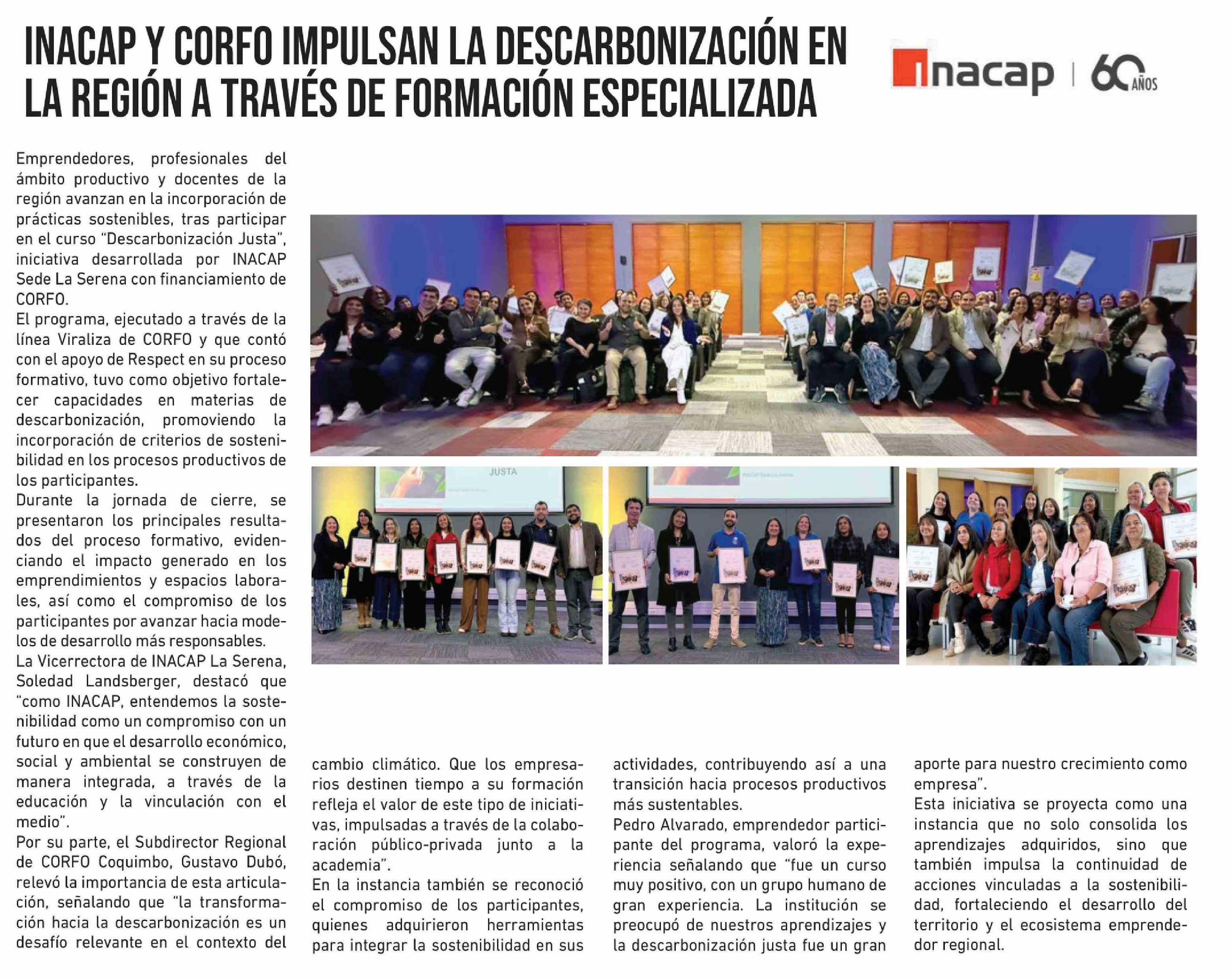 INACAP Y CORFO IMPULSAN LA DESCARBONIZACIÓN EN LA REGIÓN A TRAVÉS DE FORMACIÓN ESPECIALIZADA
