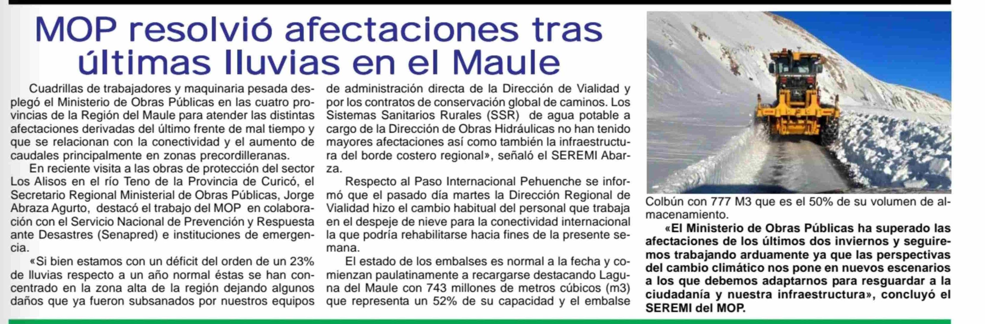 MOP resolvió afectaciones tras últimas lluvias en el Maule