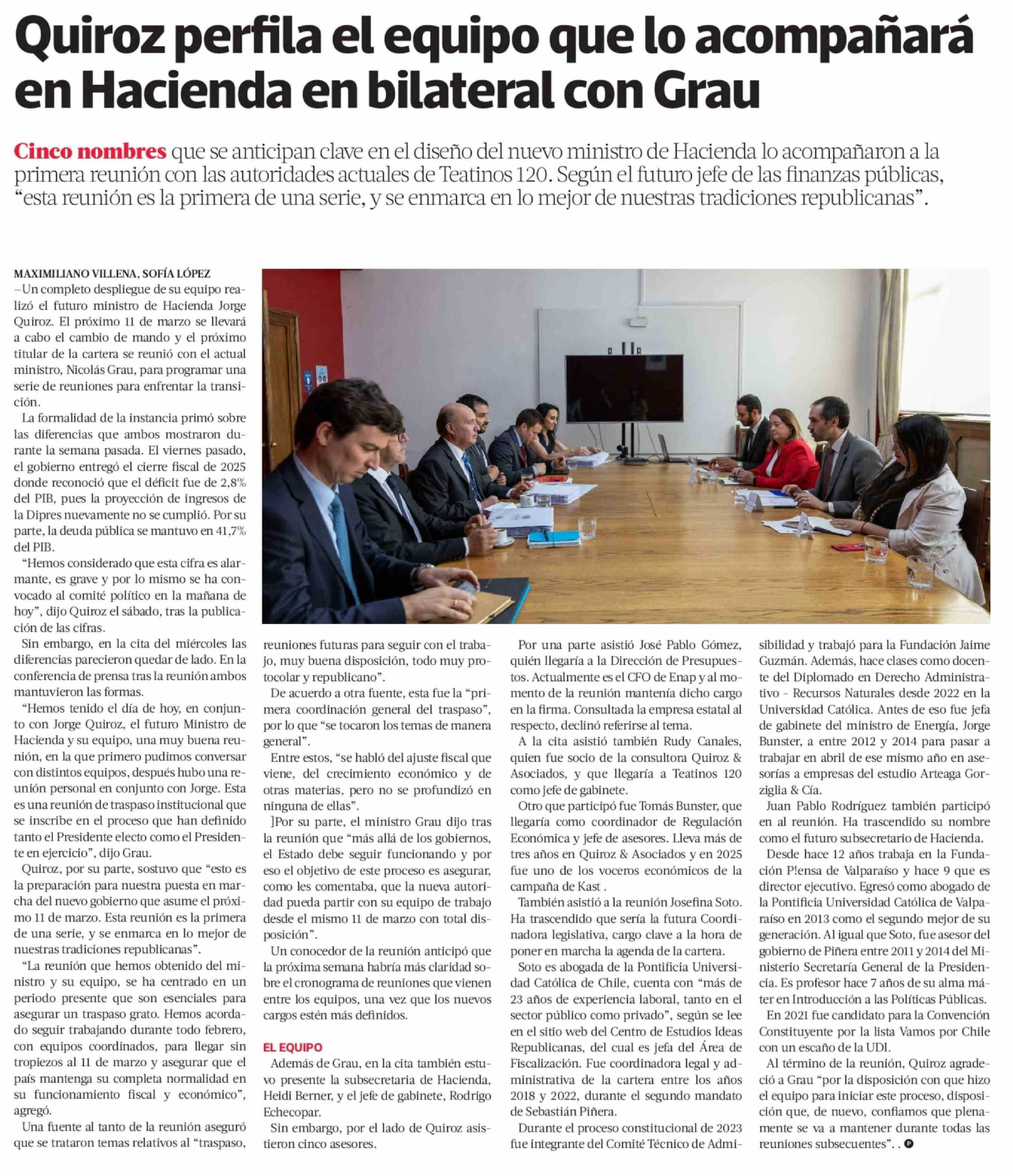 Quiroz perfila el equipo que lo acompañará en Hacienda en bilateral con Grau