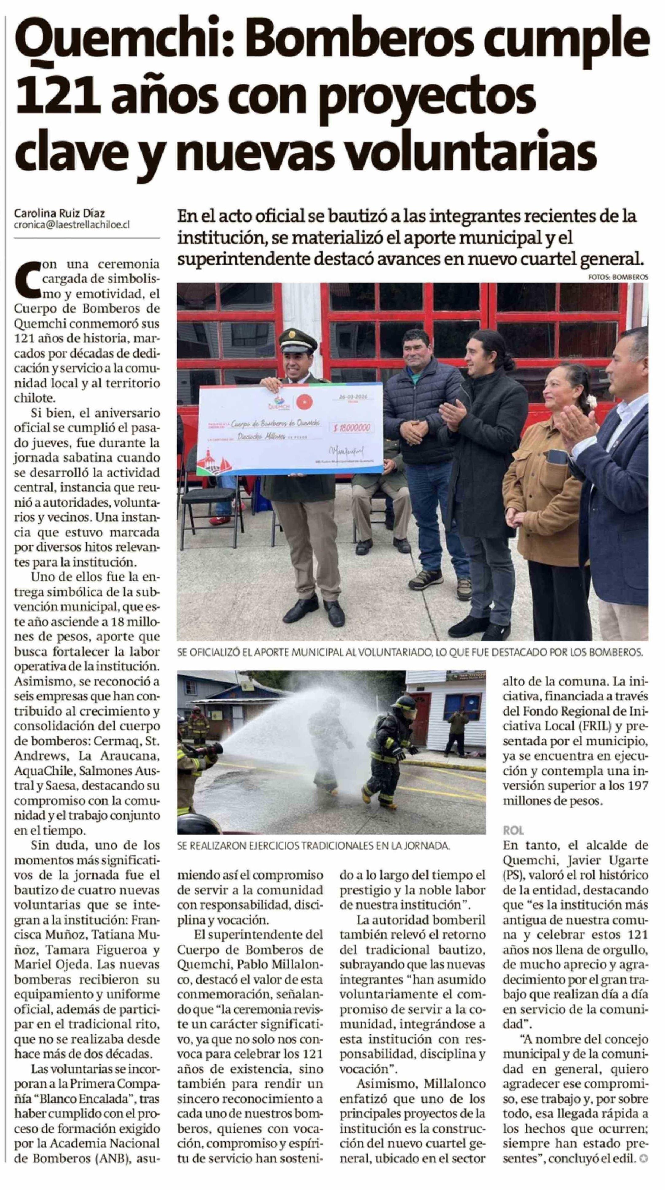 Quemchi: Bomberos cumple 121 años con proyectos clave y nuevas voluntarias