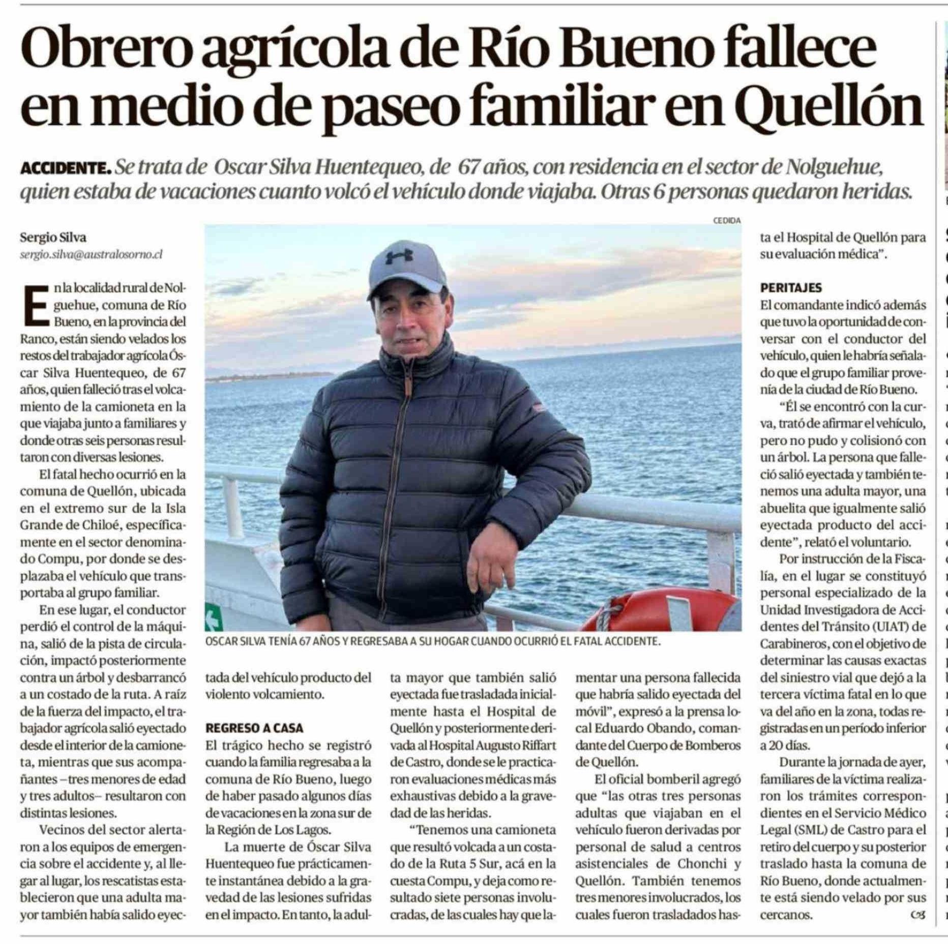 Obrero agrícola de Río Bueno fallece en medio de paseo familiar en Quellón
