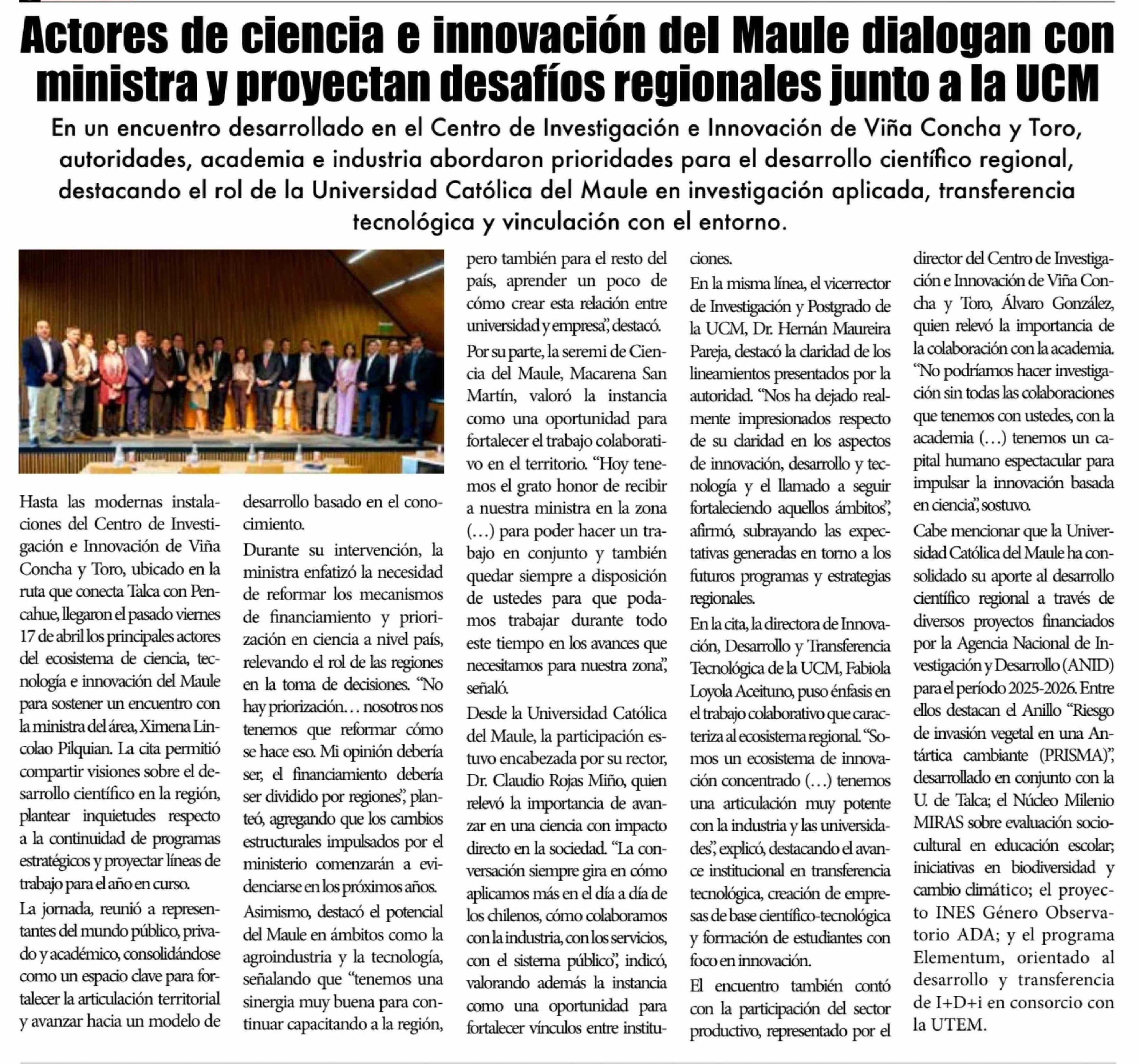 Actores de ciencia e innovación del Maule dialogan con ministra y proyectan desafíos regionales junto a la UCM