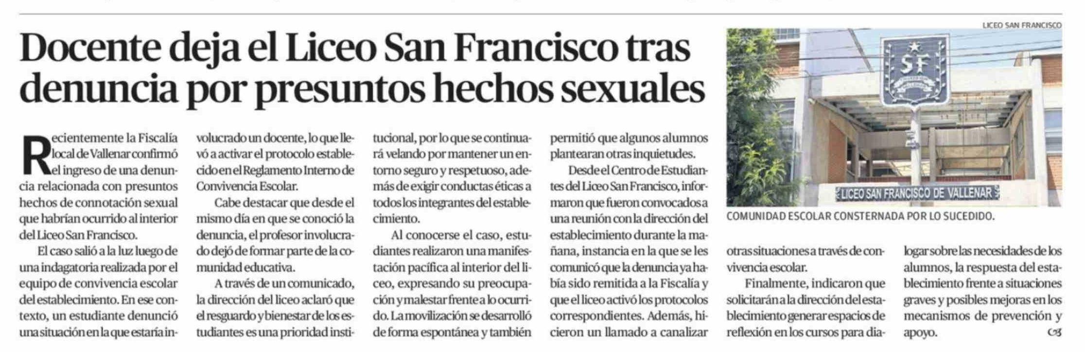 Docente deja el Liceo San Francisco tras denuncia por presuntos hechos sexuales
