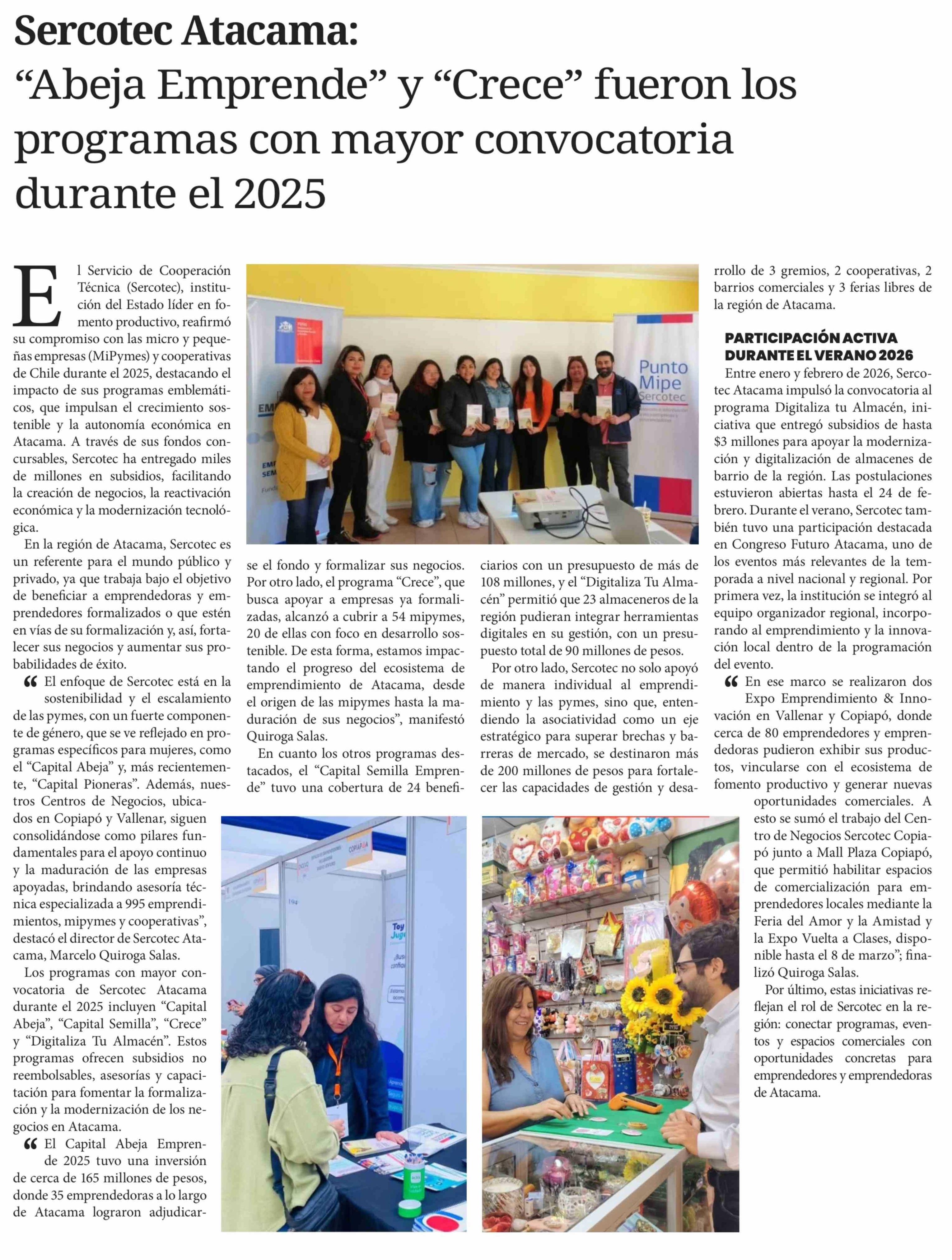 Sercotec Atacama: "Abeja Emprende" y "Crece" fueron los programas con mayor convocatoria durante el 2025