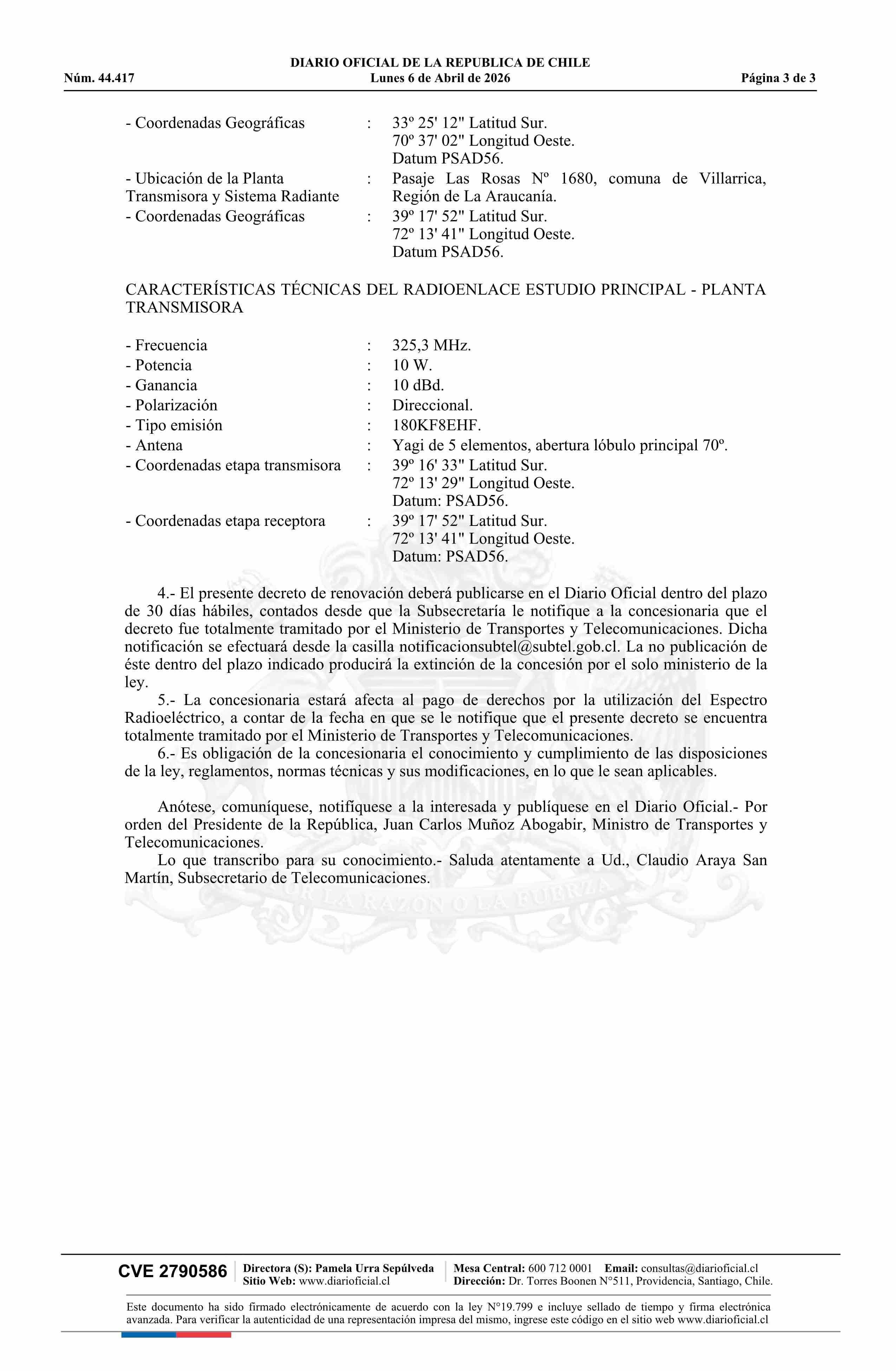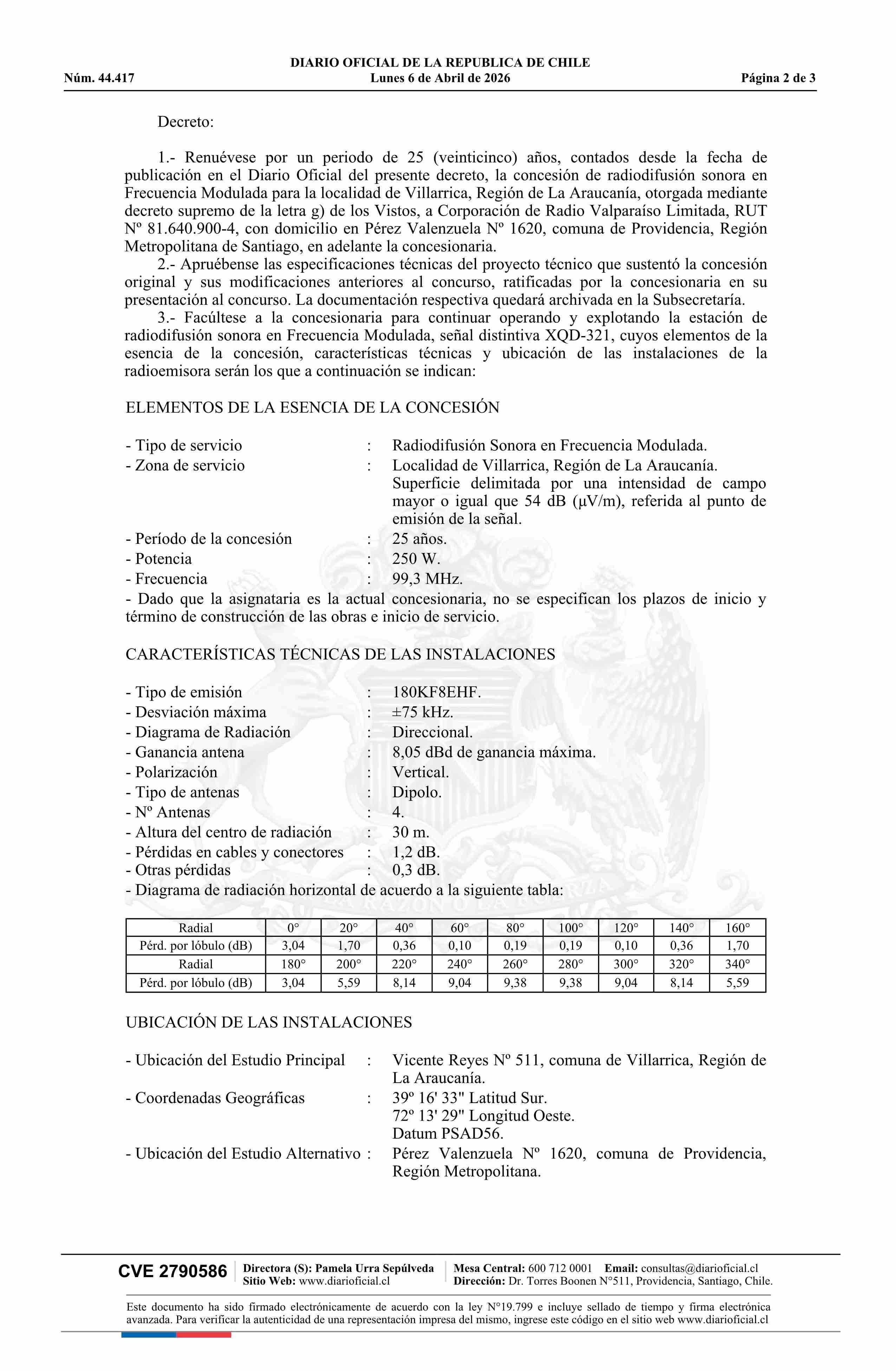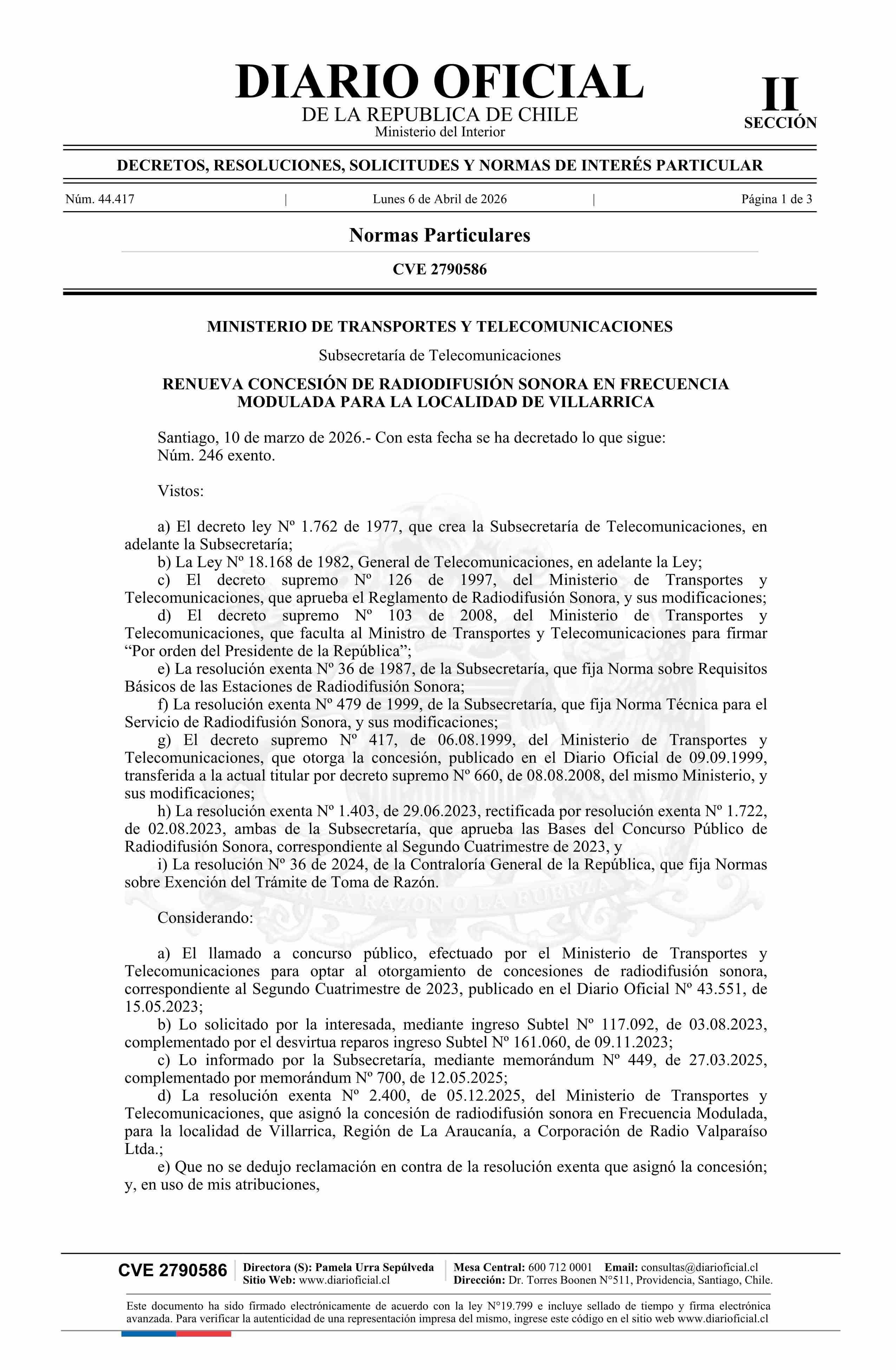 | Título: | Decreto exento número 246, de 2026.- Renueva concesión de radiodifusión sonora en frecuencia modulada para la localidad de Villarrica |