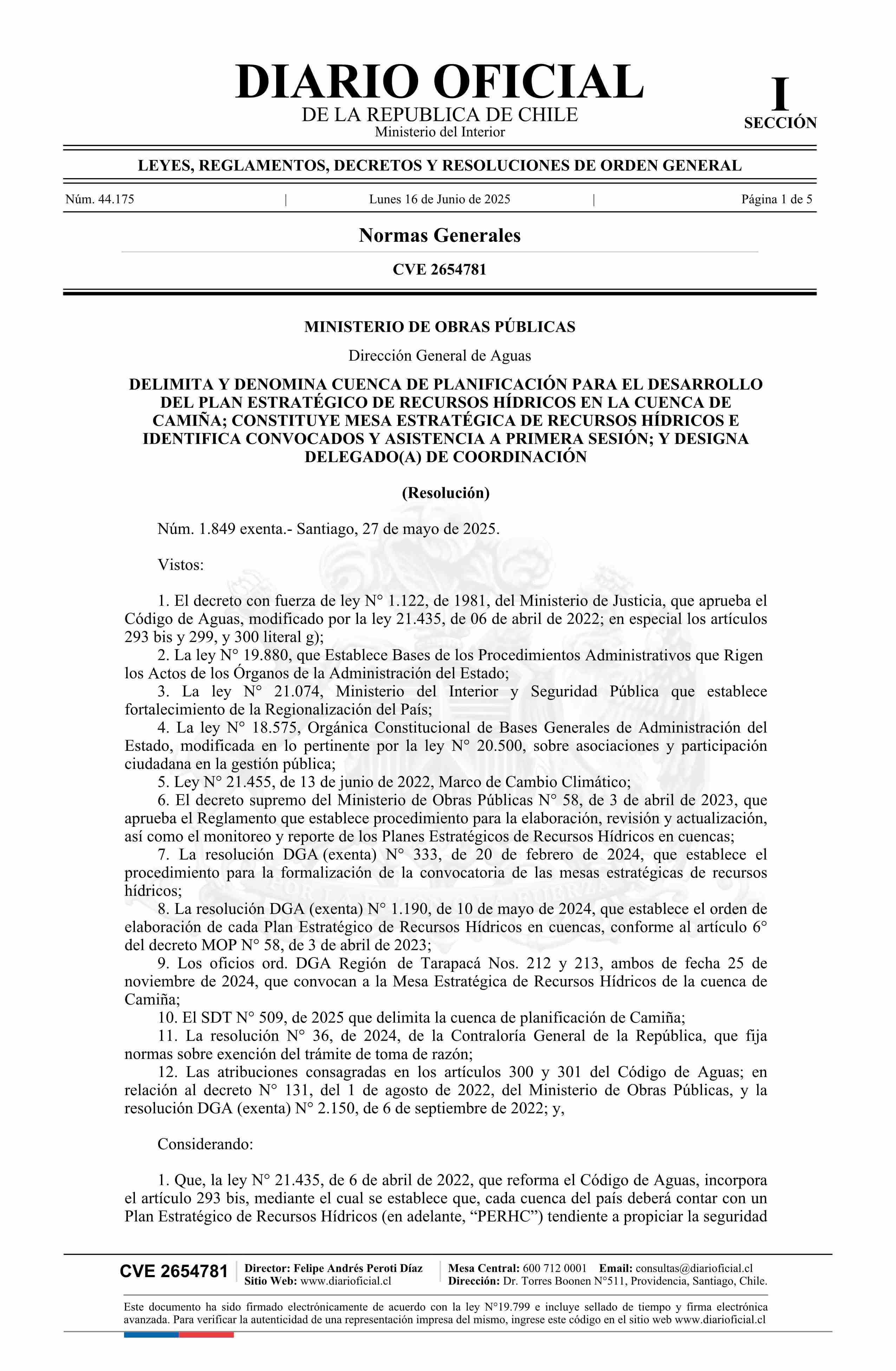 | Título: | Resolución exenta número 1.849, de 2025.- Delimita y denomina cuenca de planificación para el desarrollo del Plan Estratégico de Recursos Hídricos en la Cuenca de Camiña; constituye mesa estratégica de recursos hídricos e identifica convocados y asistencia a primera sesión; y designa Delegado(a) de |