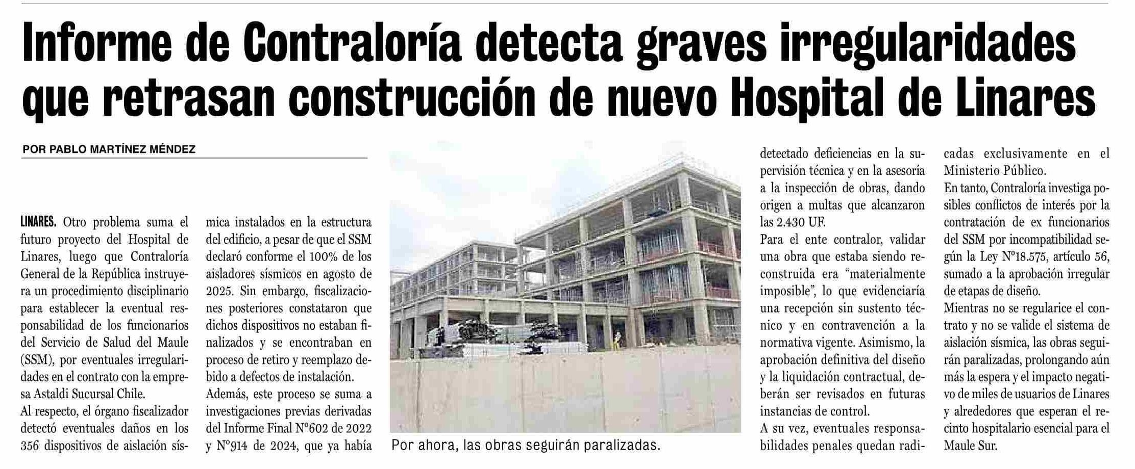 Informe de Contraloría detecta graves irregularidades que retrasan construcción de nuevo Hospital de Linares