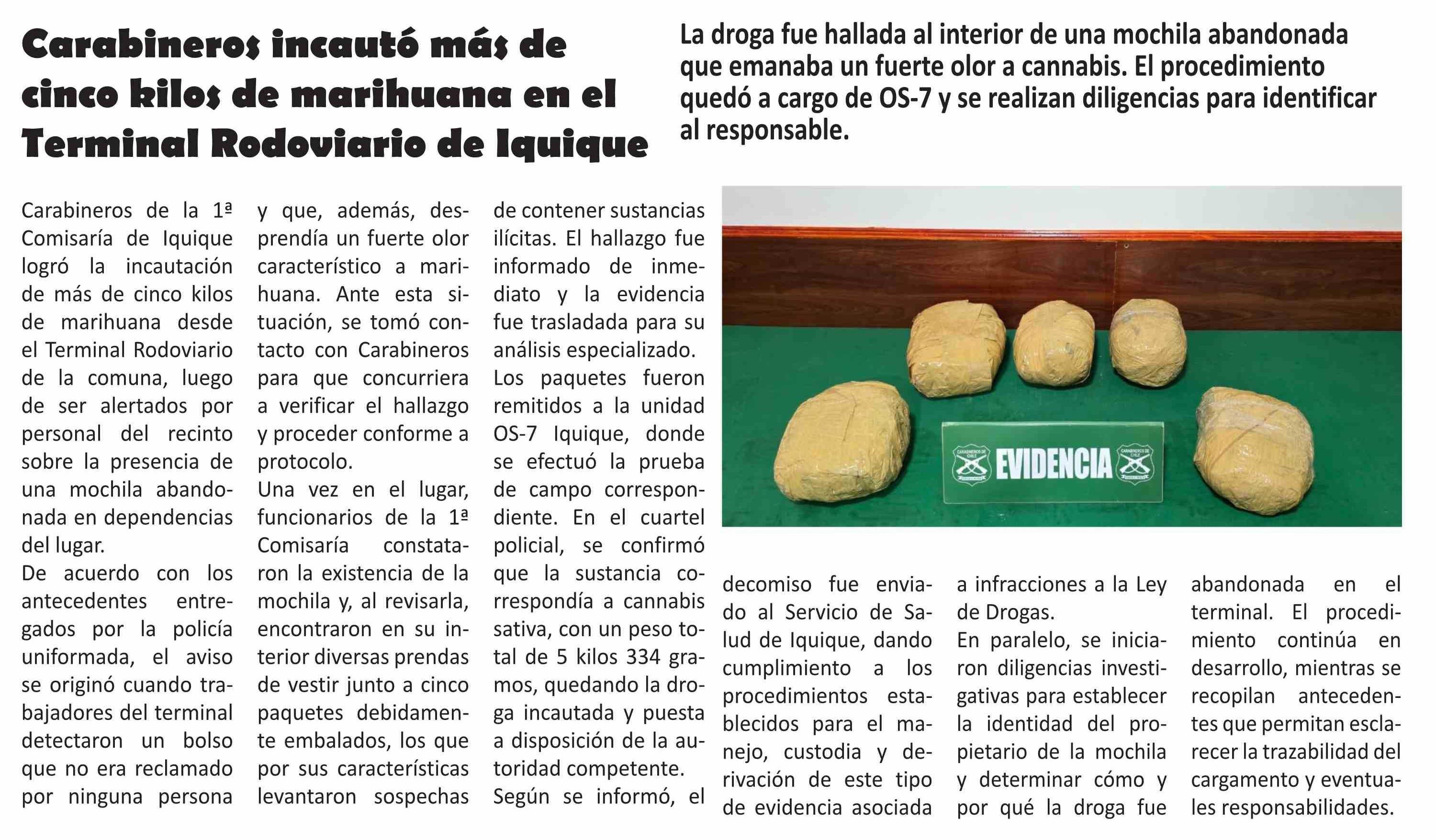 Carabineros incautó más de cinco kilos de marihuana en el Terminal Rodoviario de Iquique