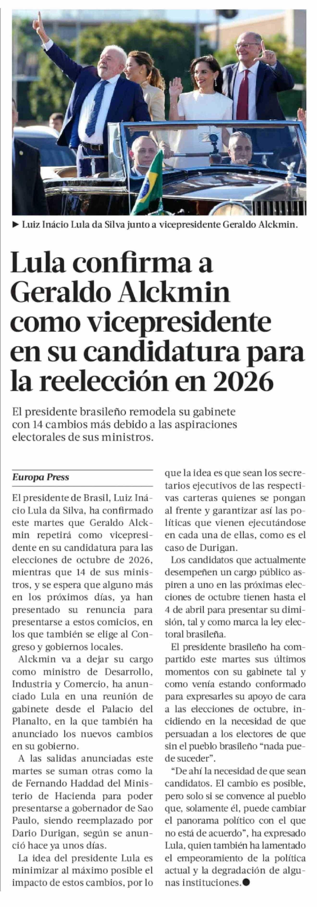 Lula confirma a Geraldo Alckmin como vicepresidente en su candidatura para la reelección en 2026