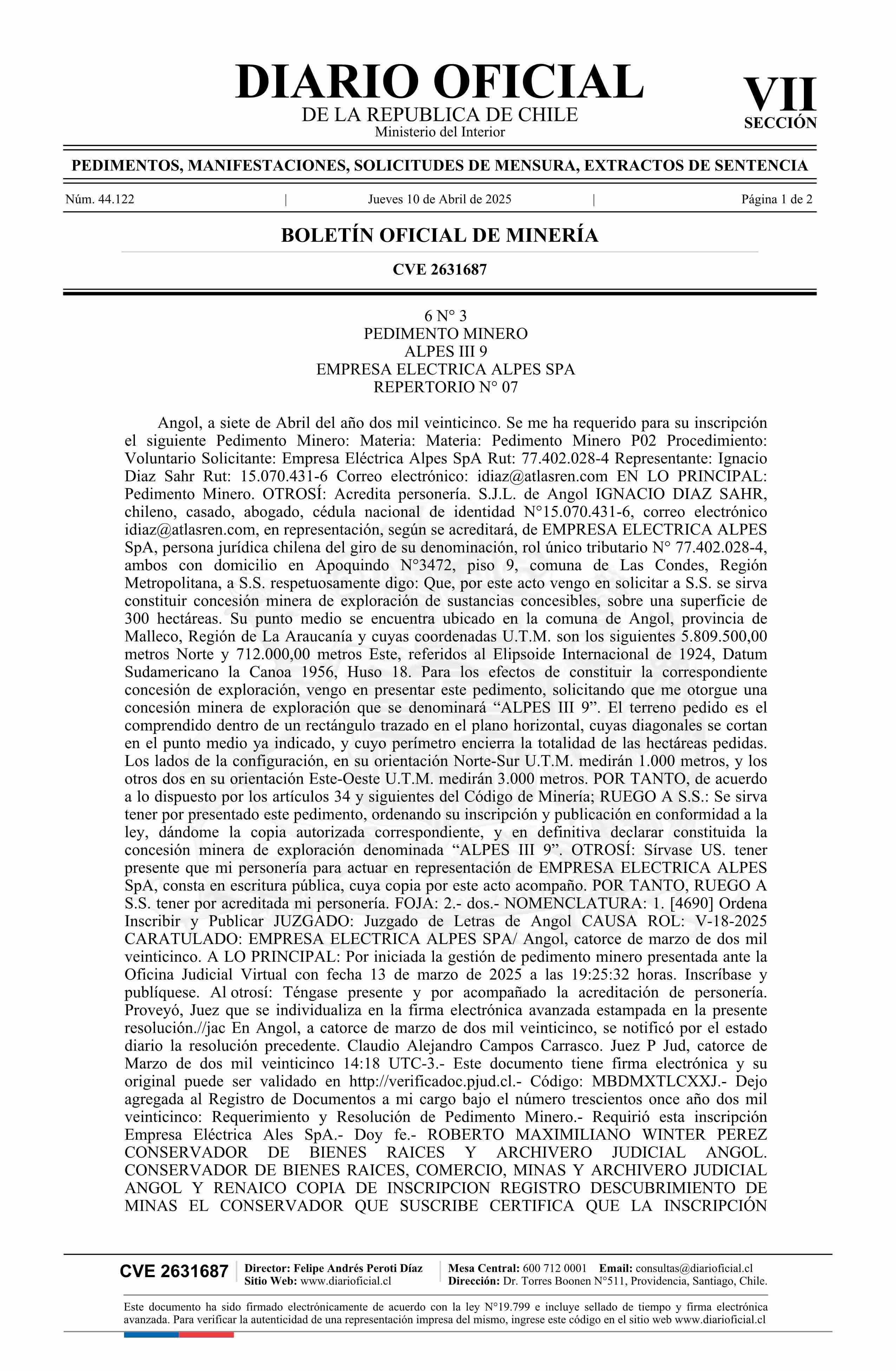 DIARIO OFICIAL CHILE - BOLETÍN OFICIAL DE MINERÍA (DIARIO OFICIAL CHILE – BOM – PEDIMENTOS MINEROS)