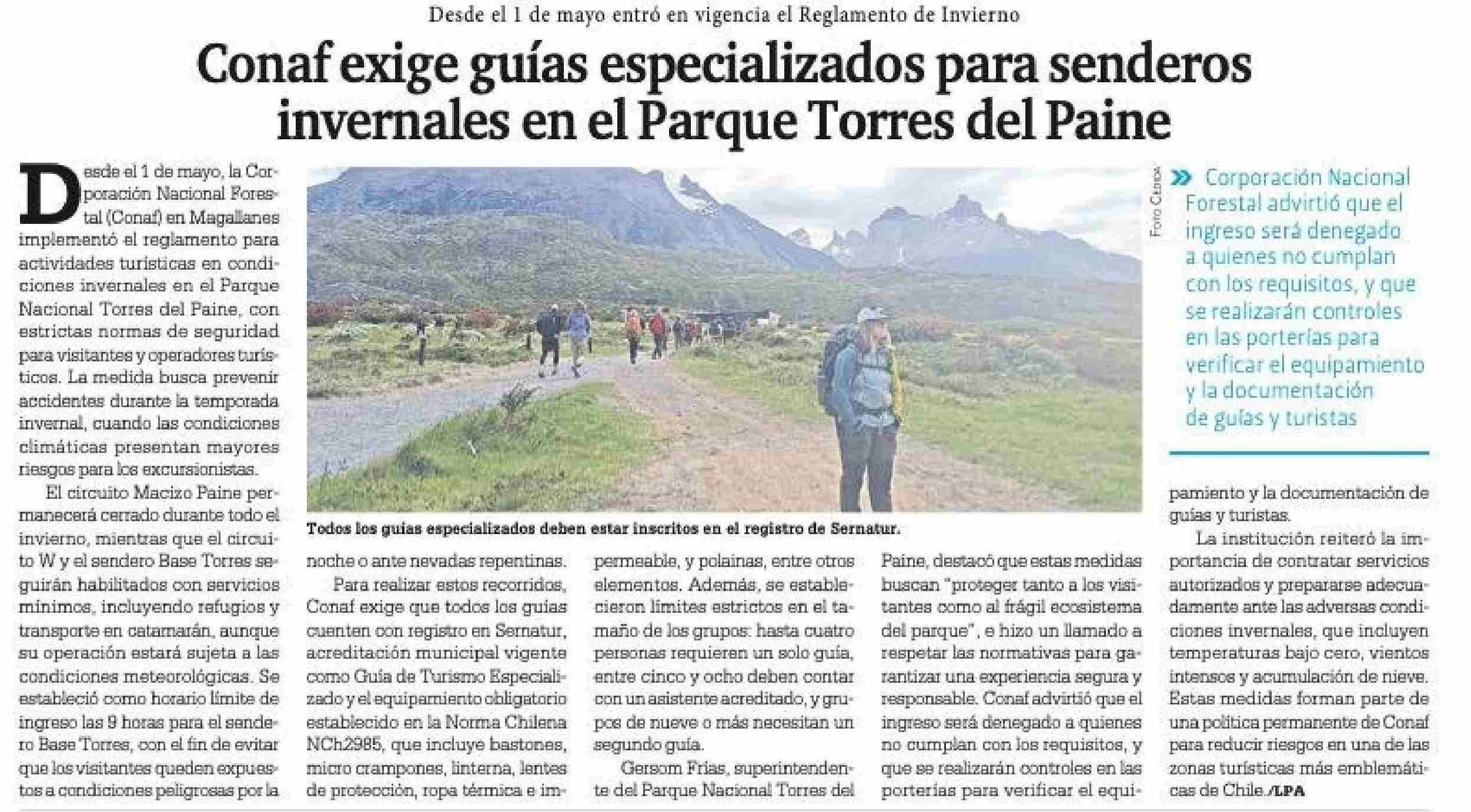 Conaf exige guías especializados para senderos invernales en el Parque Torres del Paine