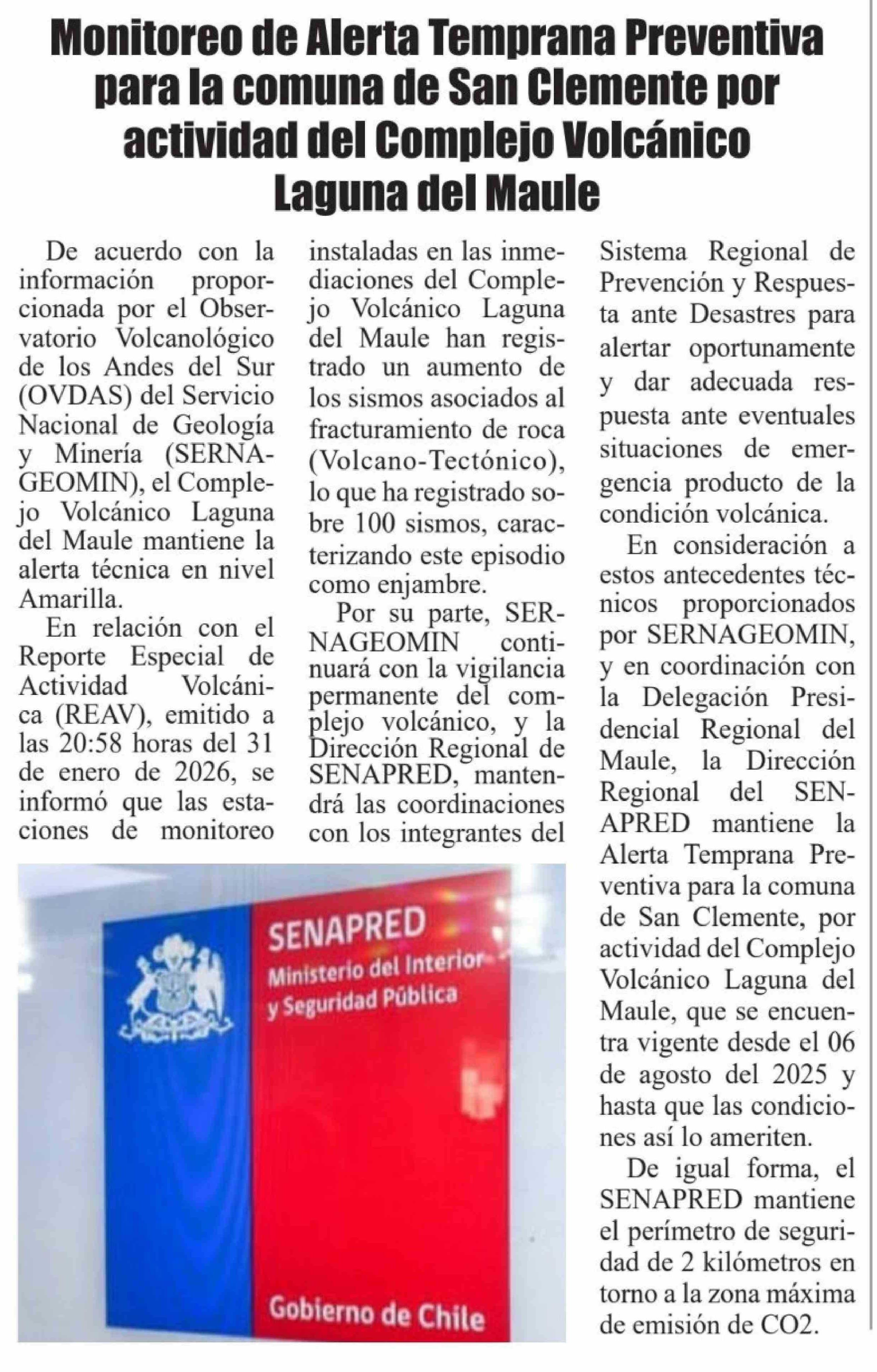 Monitoreo de Alerta Temprana Preventiva para la comuna de San Clemente por actividad del Complejo Volcánico Laguna del Maule