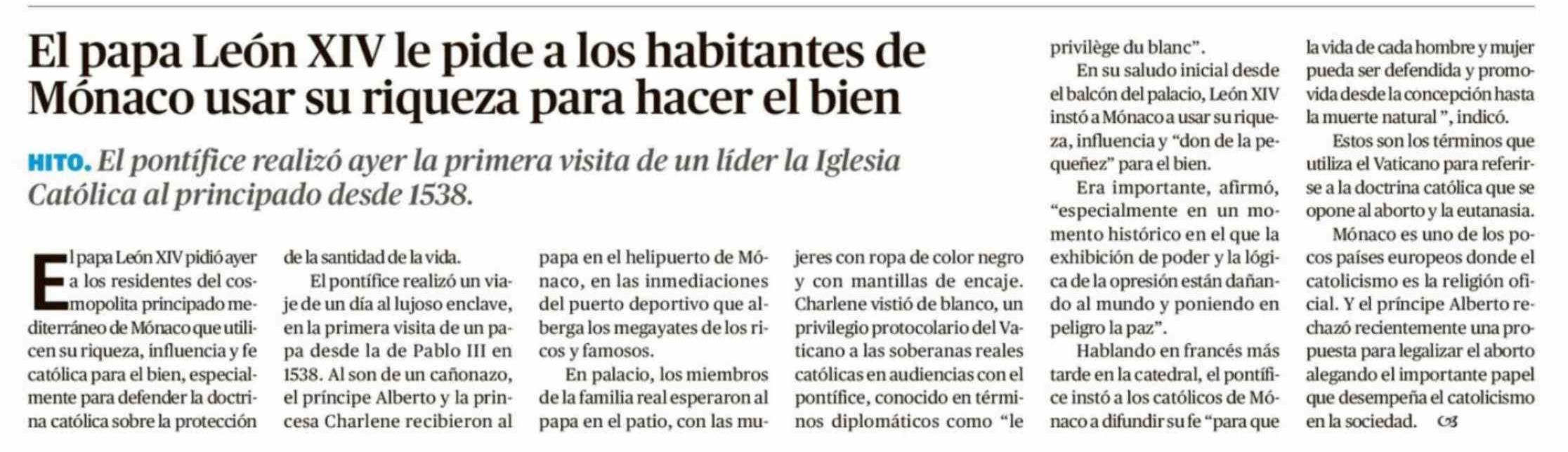 El papa León XIV le pide a los habitantes de Mónaco usar su riqueza para hacer el bien