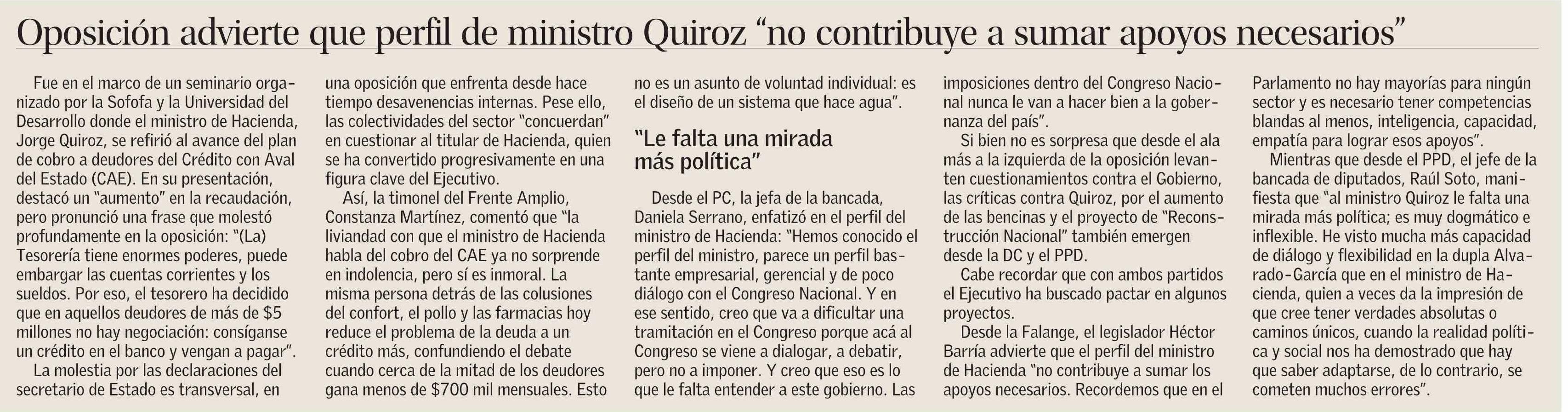 Oposición advierte que perfil de ministro Quiroz “no contribuye a sumar apoyos necesarios”