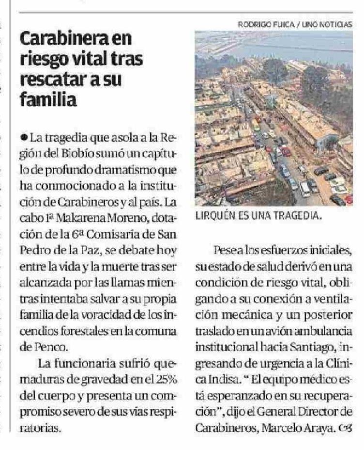 Carabinera en riesgo vital tras rescatar a su familia