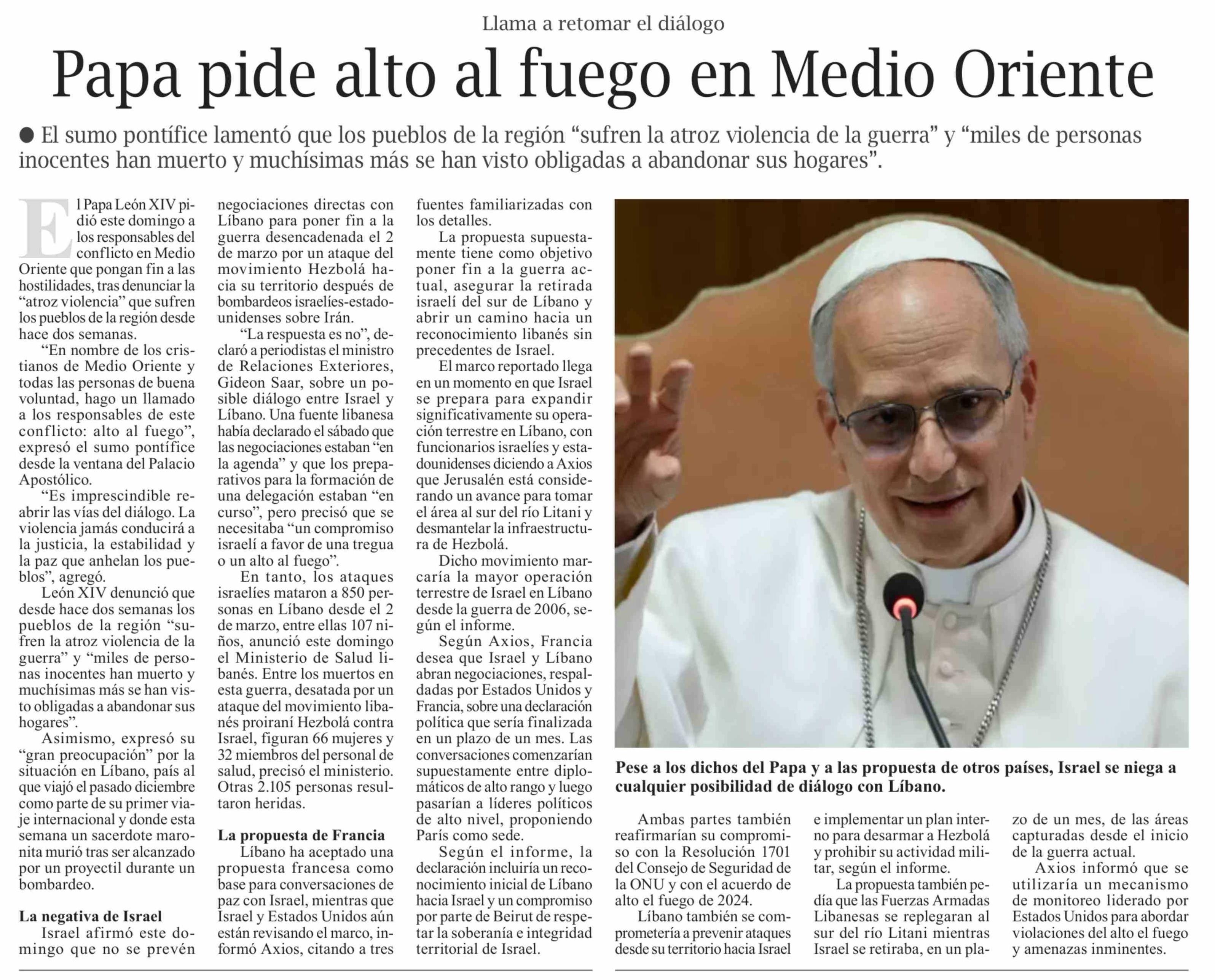 Título: Papa pide alto al fuego en Medio Oriente