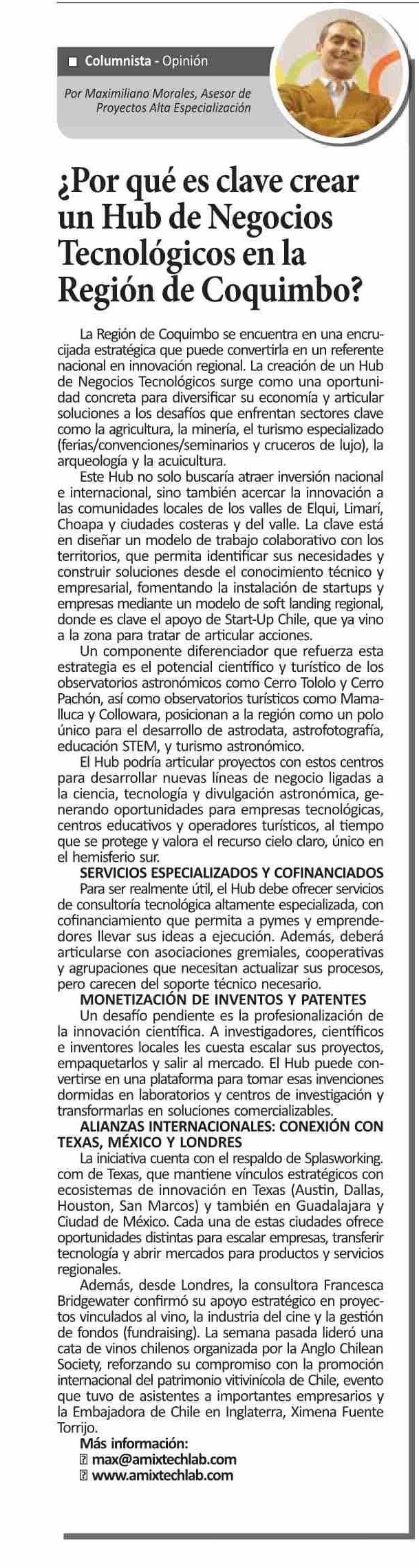 COLUMNAS DE OPINIÓN: ¿Por qué es clave crear un Hub de Negocios Tecnológicos en la Región de Coquimbo?