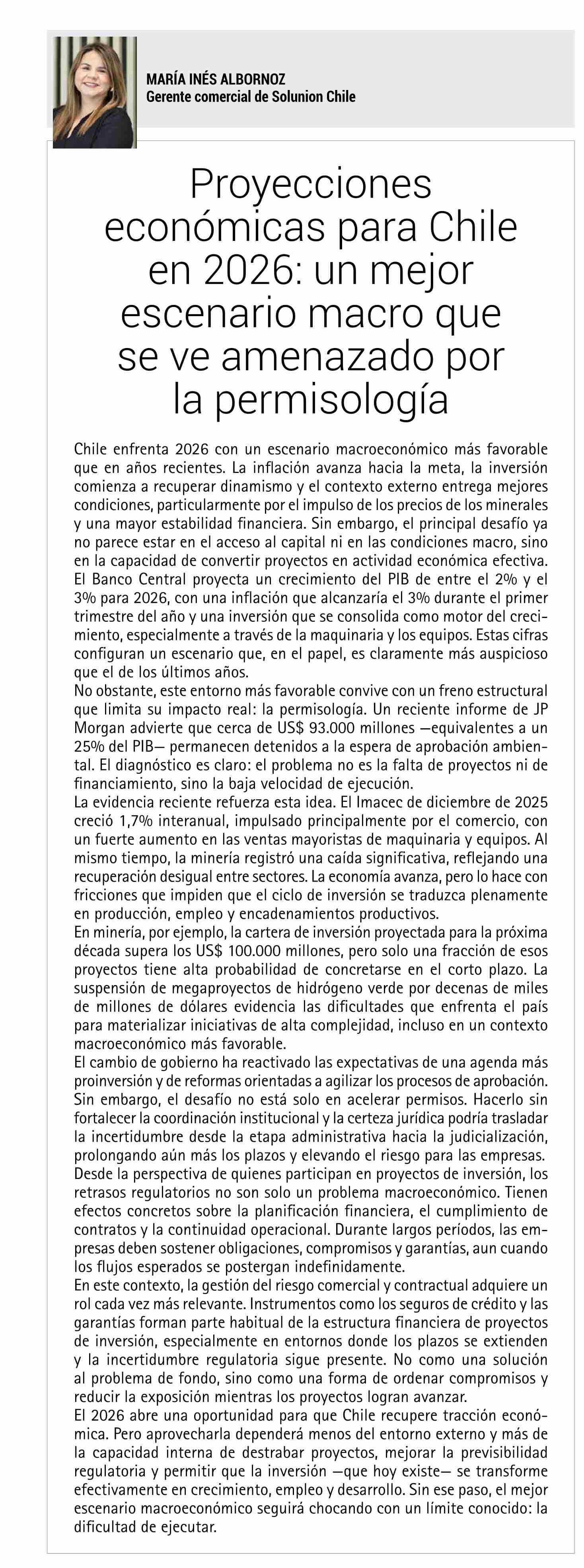 | Título: | COLUMNAS DE OPINIÓN: Proyecciones económicas para Chile 2026; un mejor escenario macro que se ve amenazado por la permisología |